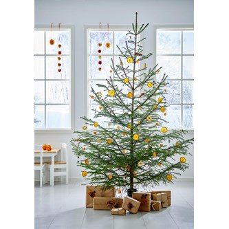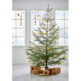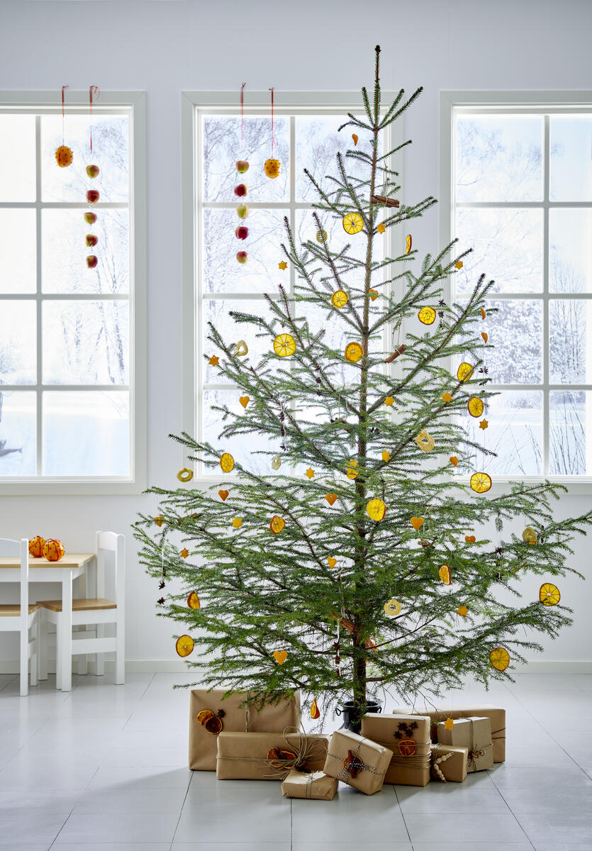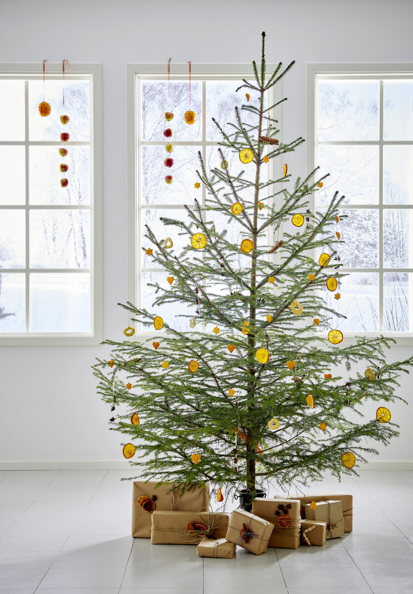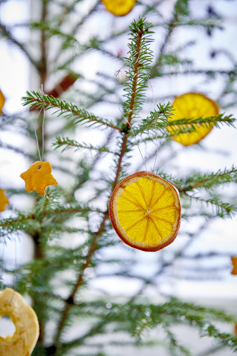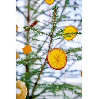 Skär apelsinerna tunt och lägg dem på en plåt. Sätt ugnen på ca 100 grader och sätt in apelsinerna. Det tar 4–6 timmar för dem att torka. Ha luckan lite på glänt. När de är klara, trä en koppar-/ståltråd genom skivorna och häng dem i granen.