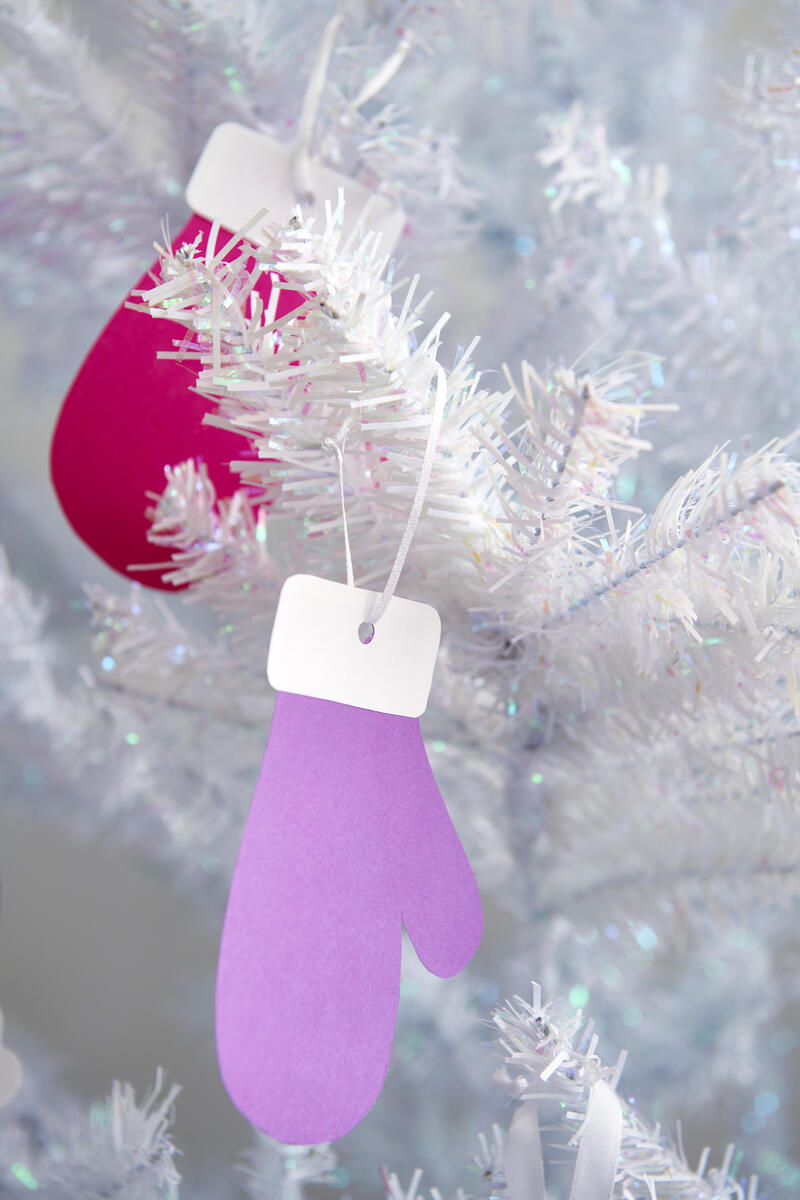 - Klipp ut i vitt papper en fyrkant som du limmar fast vid handleden på vanten. Gör ett hål i vanten och trä ett band igenom så att man kan hänga upp vanten i granen.