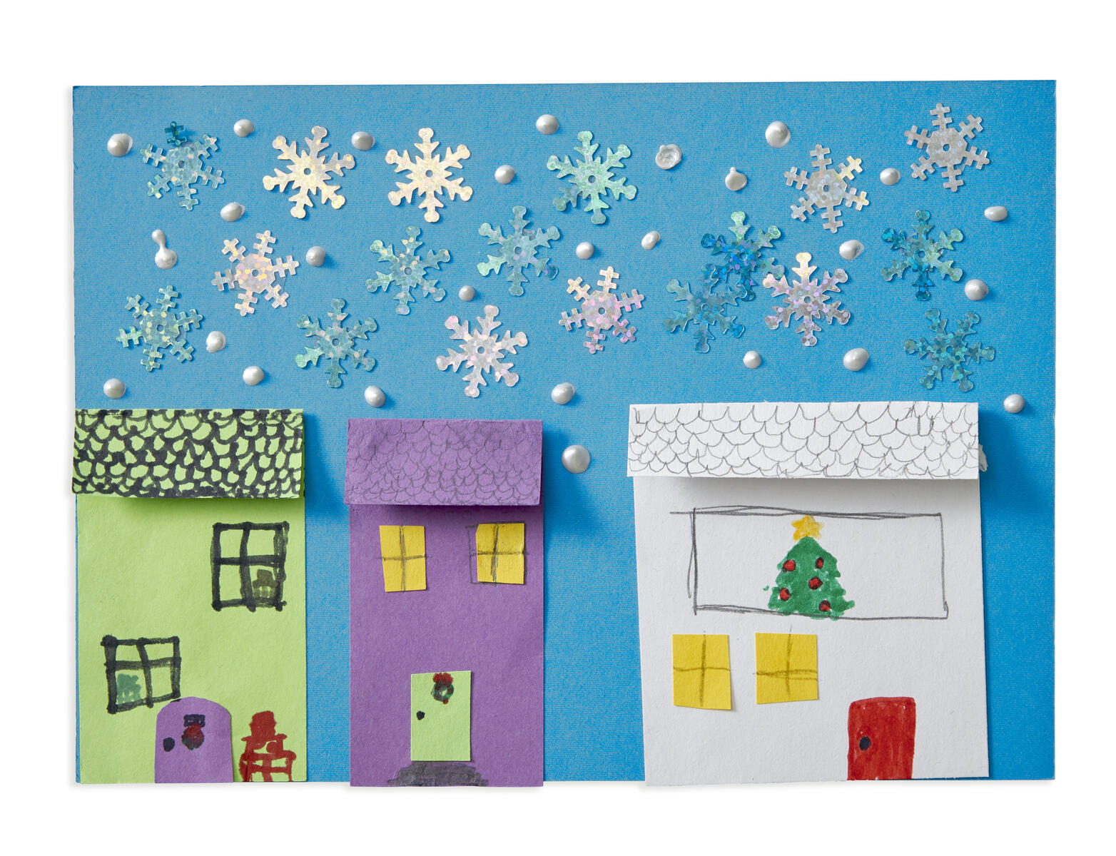 - Dörrar och fönster kan klippas ut eller ritas. Fönster av gult papper ger känslan av att lamporna är tända. I ett stort fönster kan du rita en pyntad julgran.