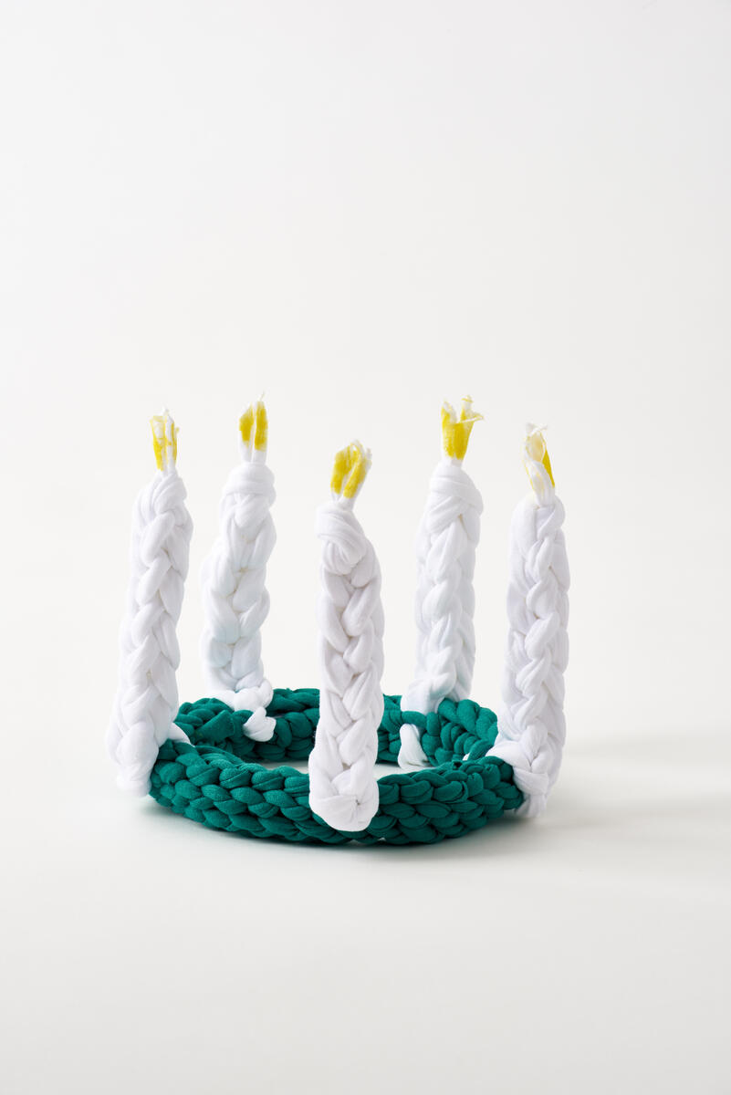 - Fäst tråden med en knut i ena änden. Lämna ca 5 cm garn kvar för att kunna knyta fast och fästa ljuset i kransen.