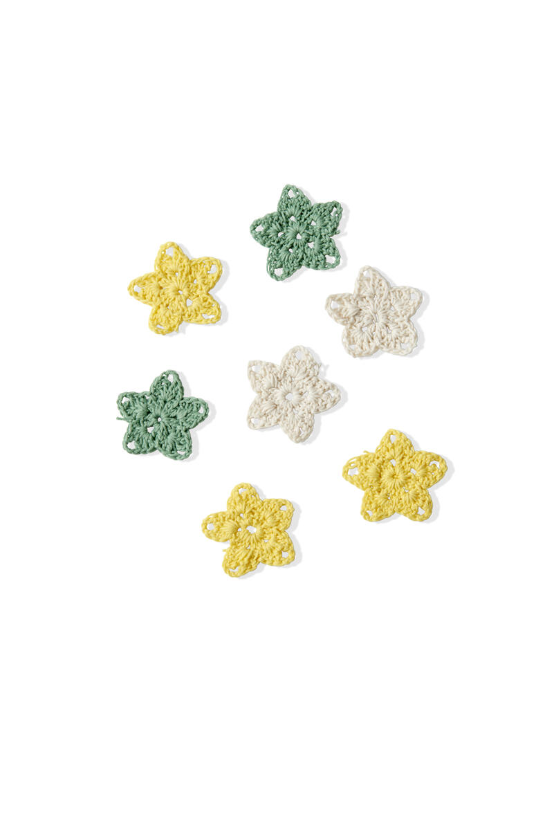 - Varv 2. Virka 3 st luftmaskor och därefter 2 st stolpar, virka sedan en luftmaska och fortsätt med 3 st stolpar tillsammans. Gör detta 4 ggr till så att du har totalt 5 st stolpgrupper.