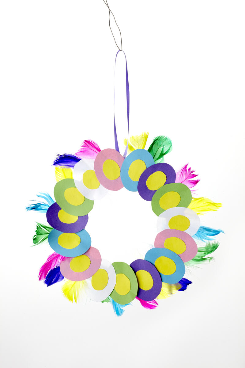 - Lägg ut ägg-formerna så det bildas en krans. Limma ihop äggen med varandra. För att förenkla kan man klippa till en bred cirkel i ett annat papper som underlag.