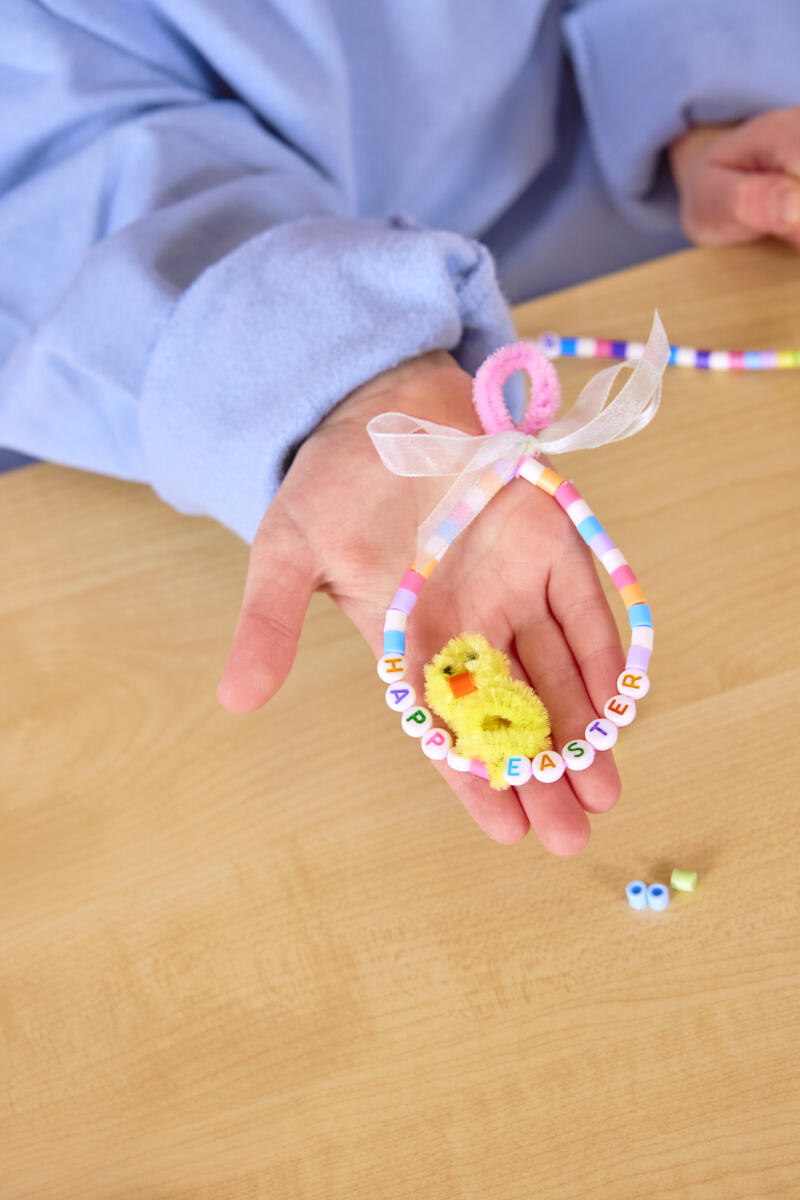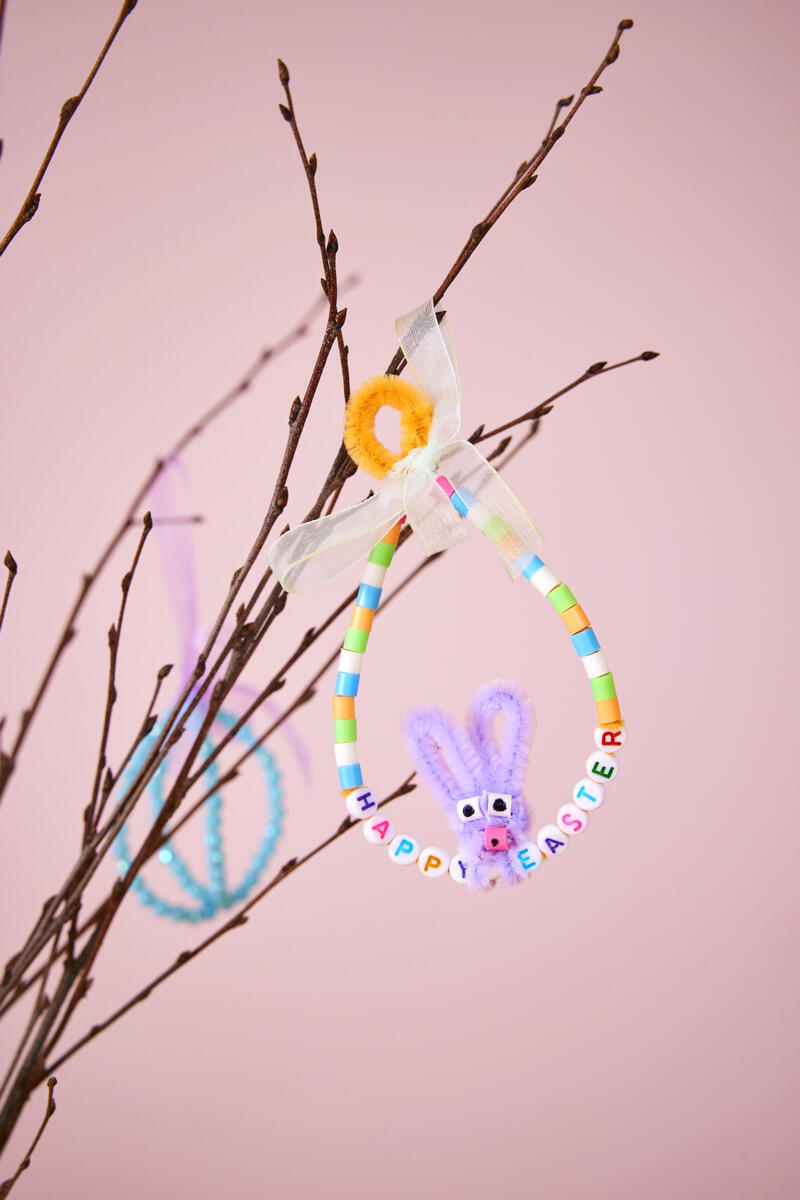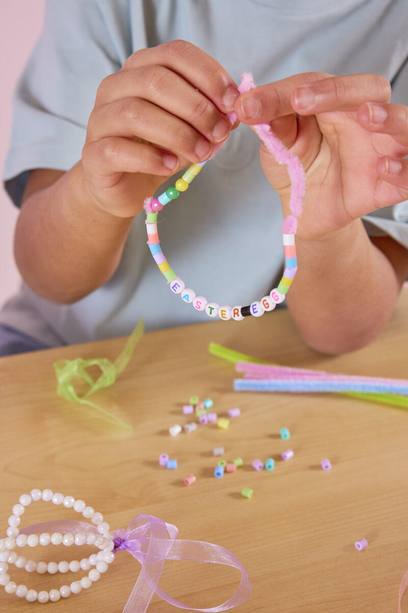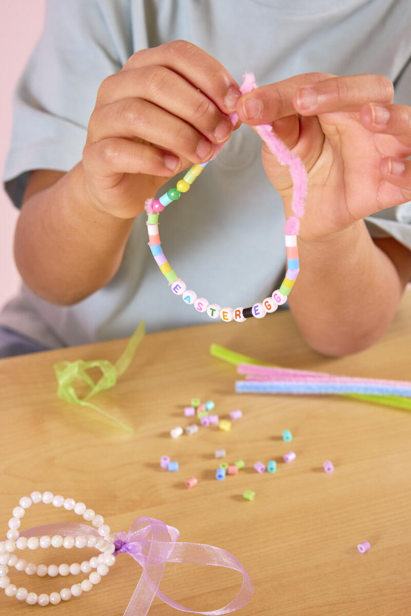 - Ta en piprensare och trä på rörpärlor samt bokstavspärlor. Eleverna kan skriva en kort påskhälsning eller egna ord, vilket samtidigt ger ett naturligt tillfälle att öva bokstäver och språklig medvetenhet. Kom ihåg att lämna lite plats i ändarna för att kunna tvinna ihop. Forma piprensaren som ett ägg och tvinna ihop den i överkant.