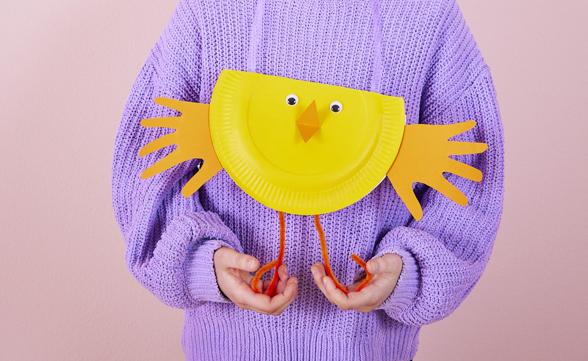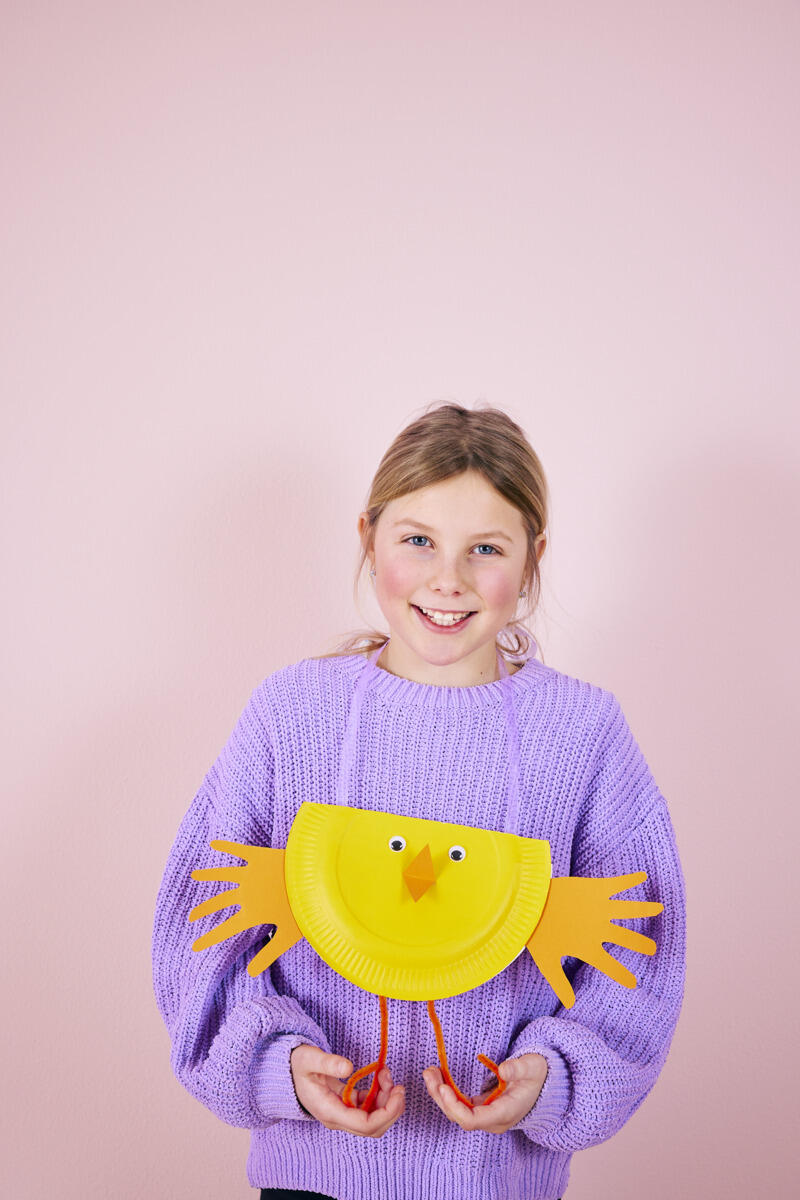 - Fäst händerna mellan de två tallrikarna, samma sak med piprensare som får agera kycklingfötter. Limma ihop tallrikarna, så att det bildar en ficka mellan. Sätt fast ett snöre för upphängning.