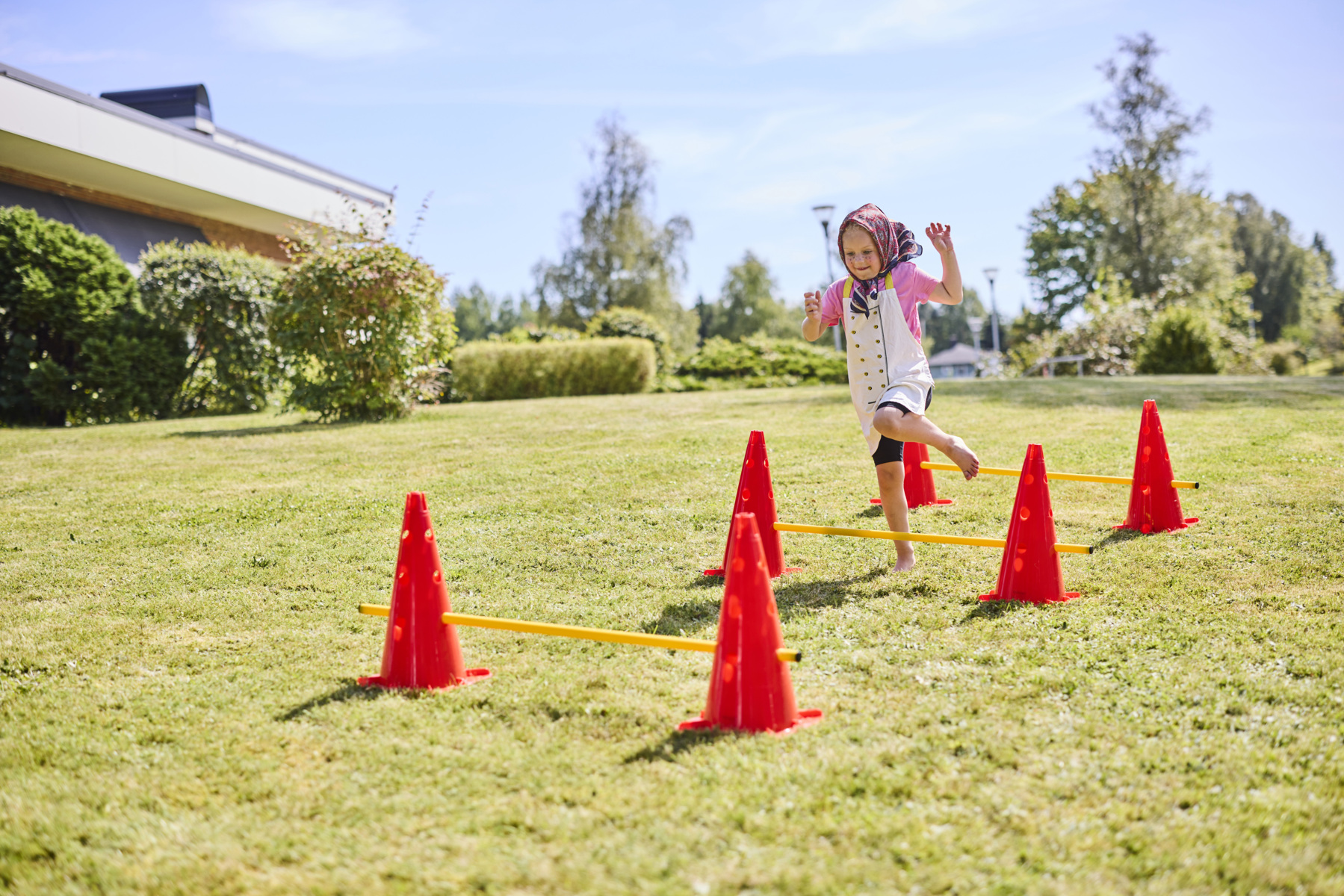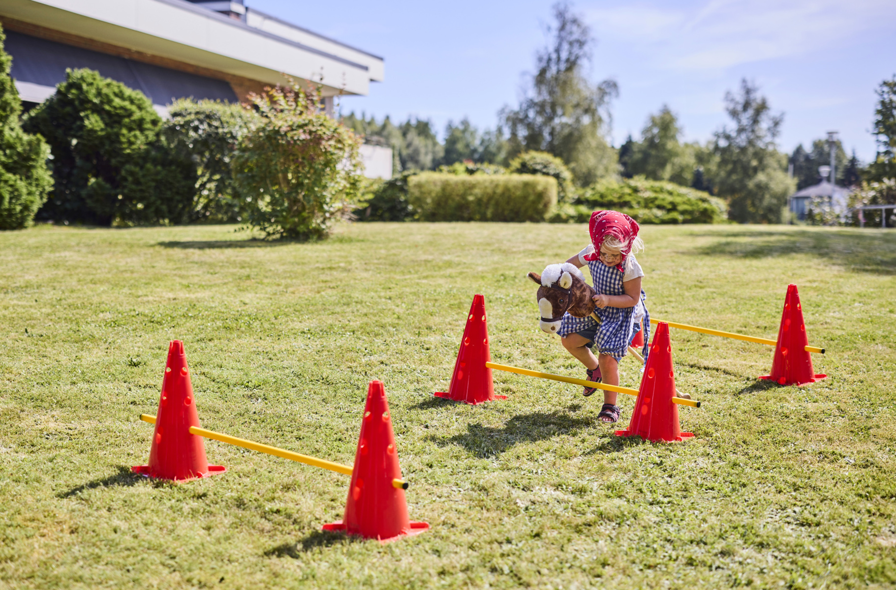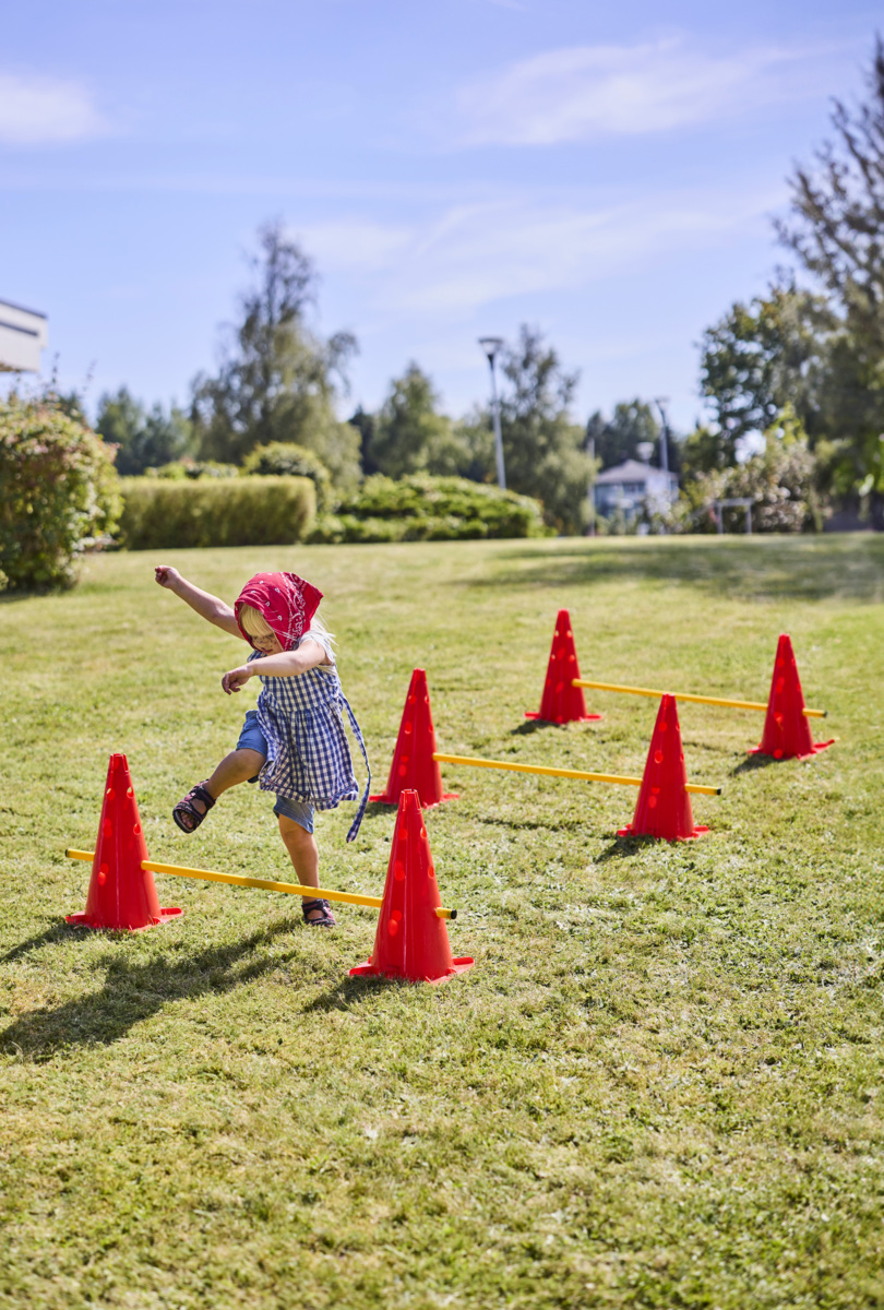 Bygg en bana tillsammans med barnen. Till vår bana har vi använt koner och stavar. Låt påskgummorna och påskgubbarna flyga fritt över banan eller med käpphästar. Vem kommer snabbast till blåkulla? En rolig motorisk övning som passar alla åldrar. Banan kan både förenklas och avanceras med allt från taktila stigar till löpstegar och lekringar.