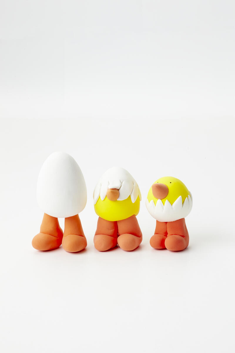 - Gör ägg av den vita leran och montera på ben och fötter.