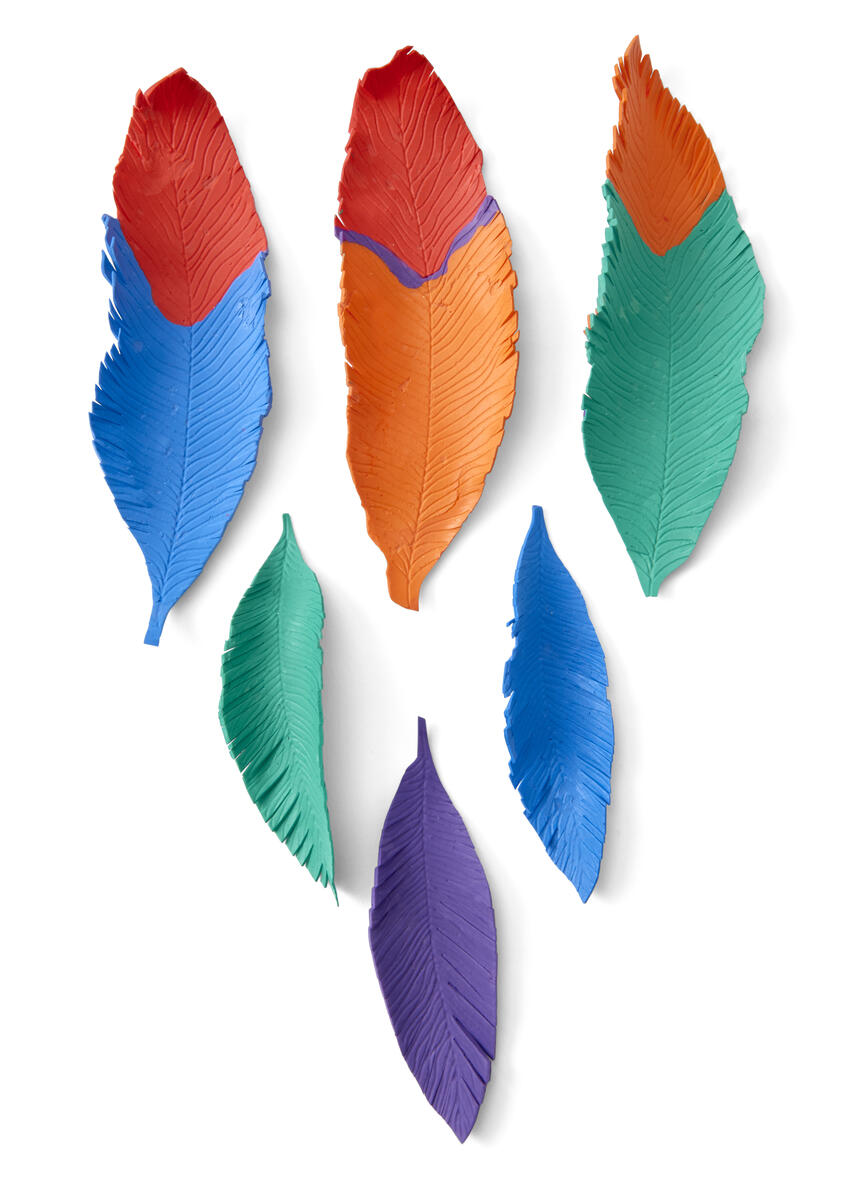 - Tryck en fjäder på leran så ett mönster bildas och ta bort fjädern.