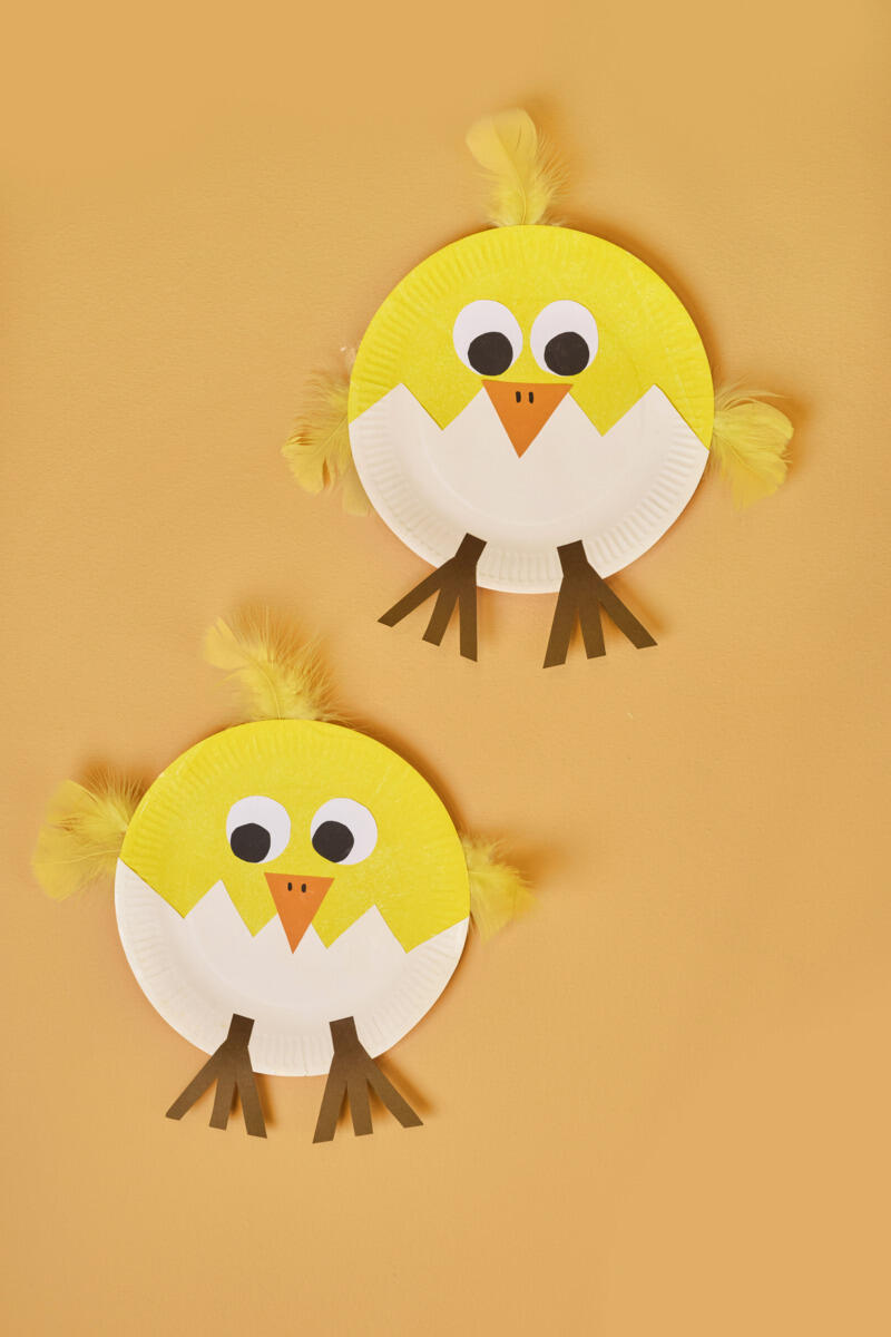 - Klipp ut ett zickzack-mönster från en vit papptallrik. Limma fast som en sprucken äggkant på den gula papptallriken.
