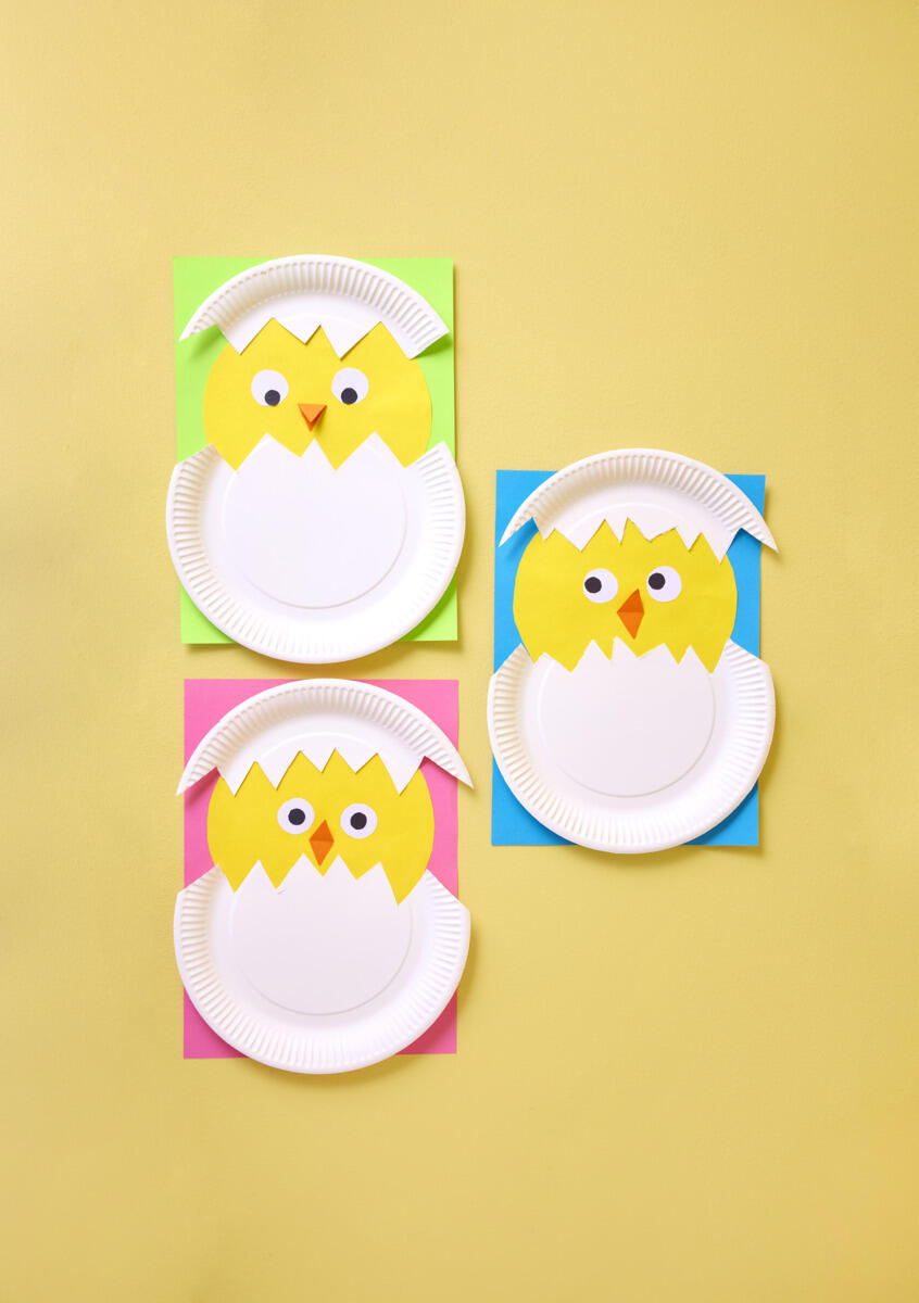- Rita ut en cirkel på ett gult papper och fäst fast ögon och näbb. Limma fast kycklingens huvud på ett A4-papper i valfri färg.