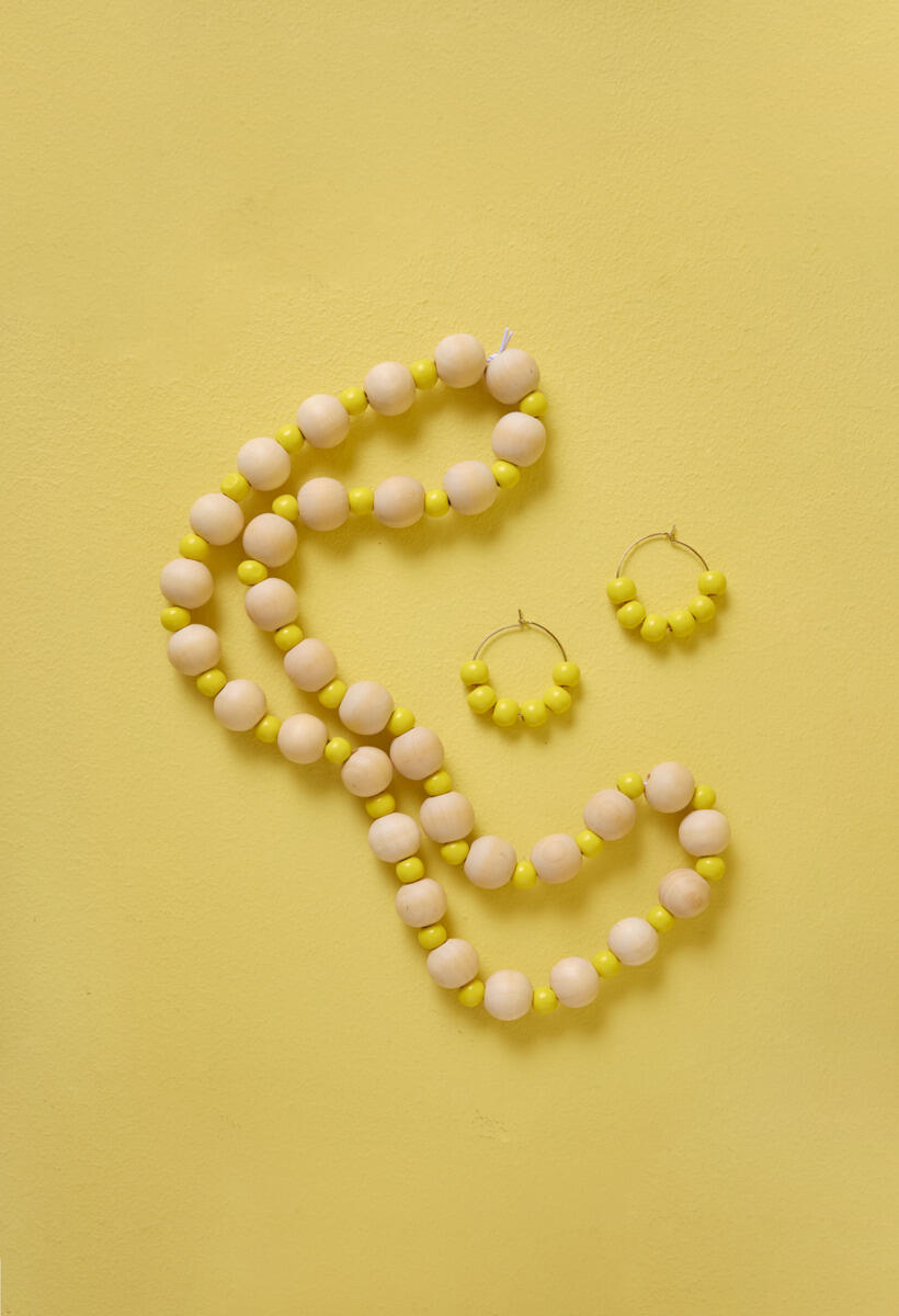 - Trä på gula träpärlor på ett kreolörhänge.