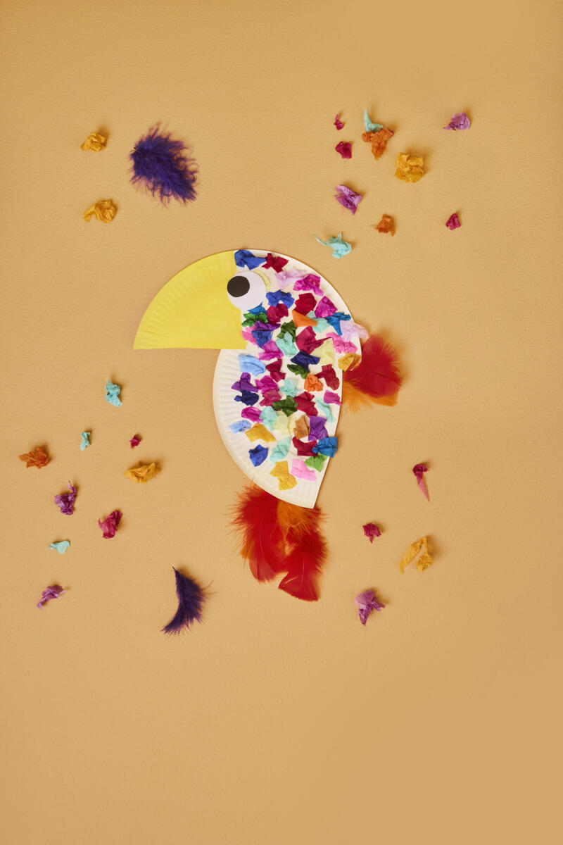 - Dekorera papegojan med bitar från silkespapper och fjädrar.