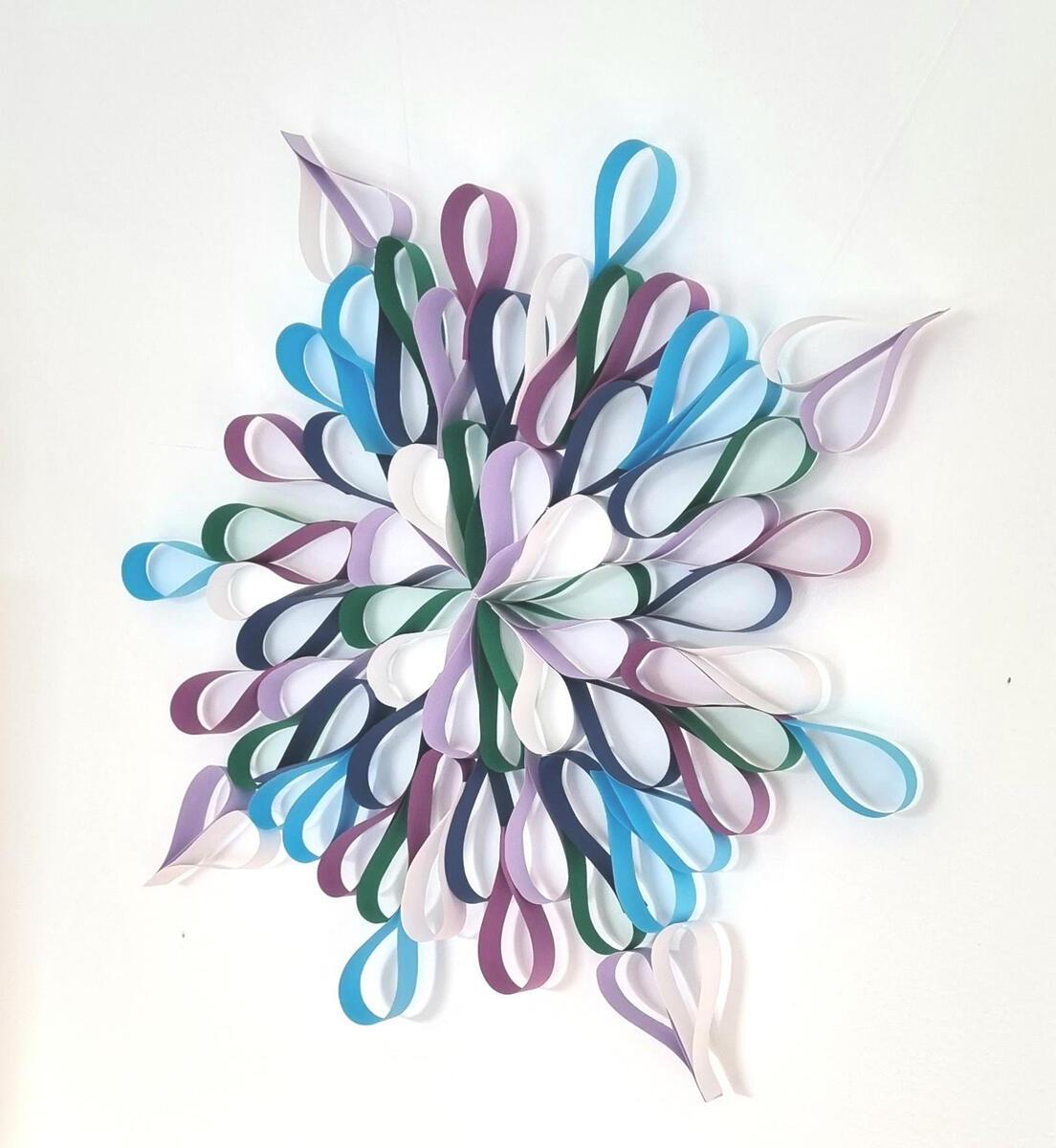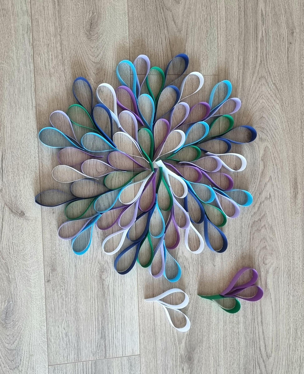 - Klipp remsor av papper i valfria färger och klistra ihop ändarna så att de formar små droppar