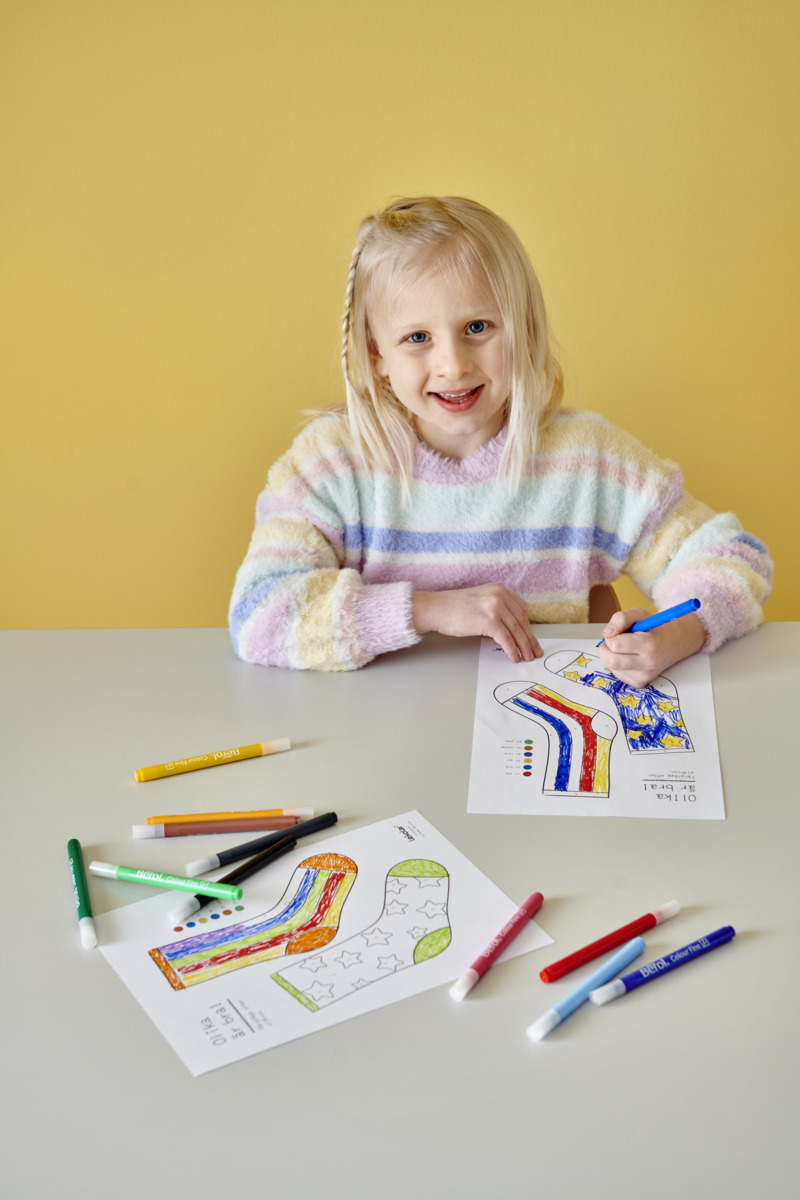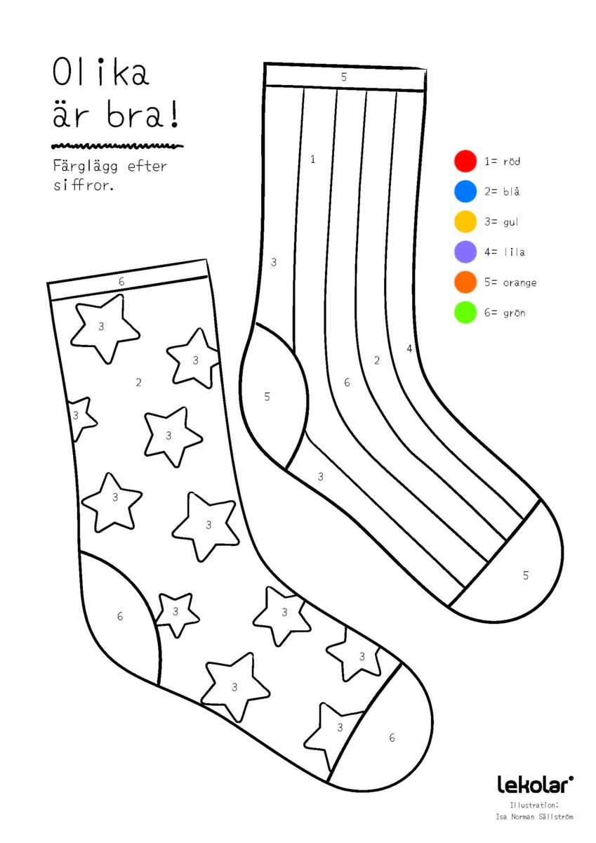 - Visa hur man läser av instruktionen där varje siffra motsvarar en färg. Låt barnen färglägga de olika områdena på strumporna utifrån instruktionen.