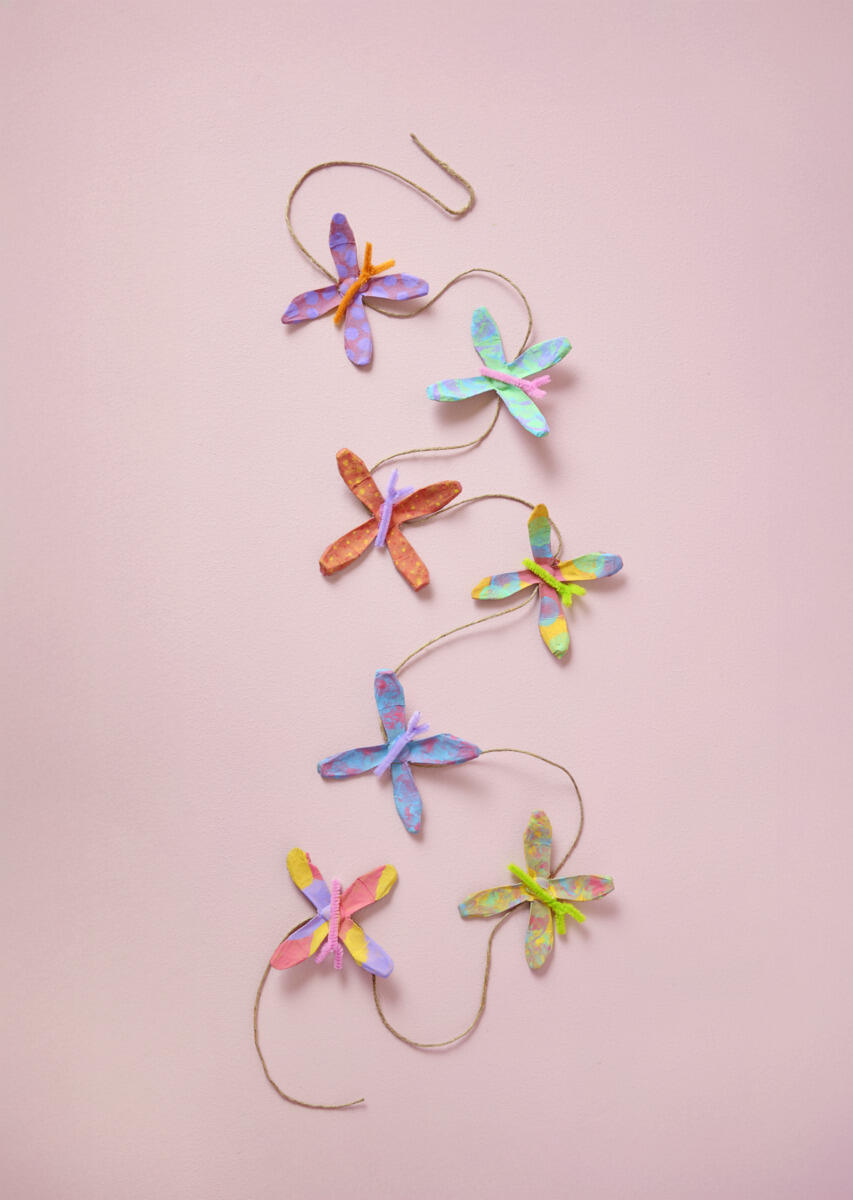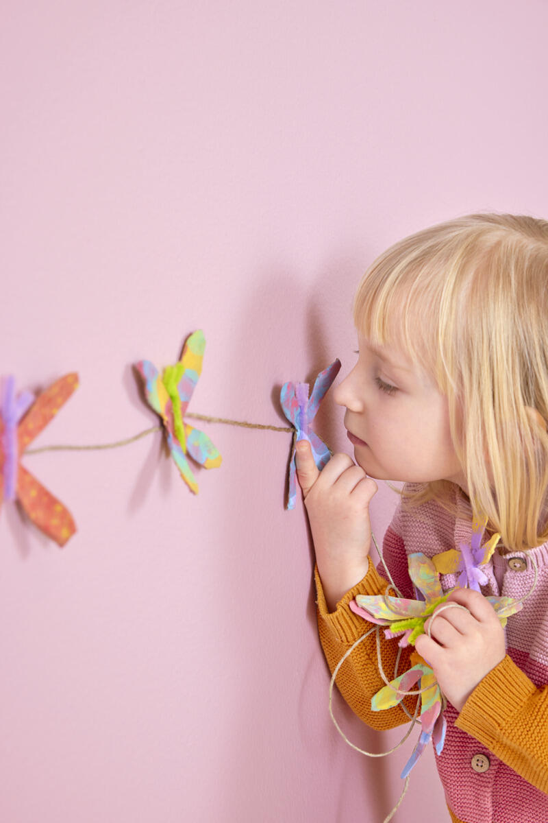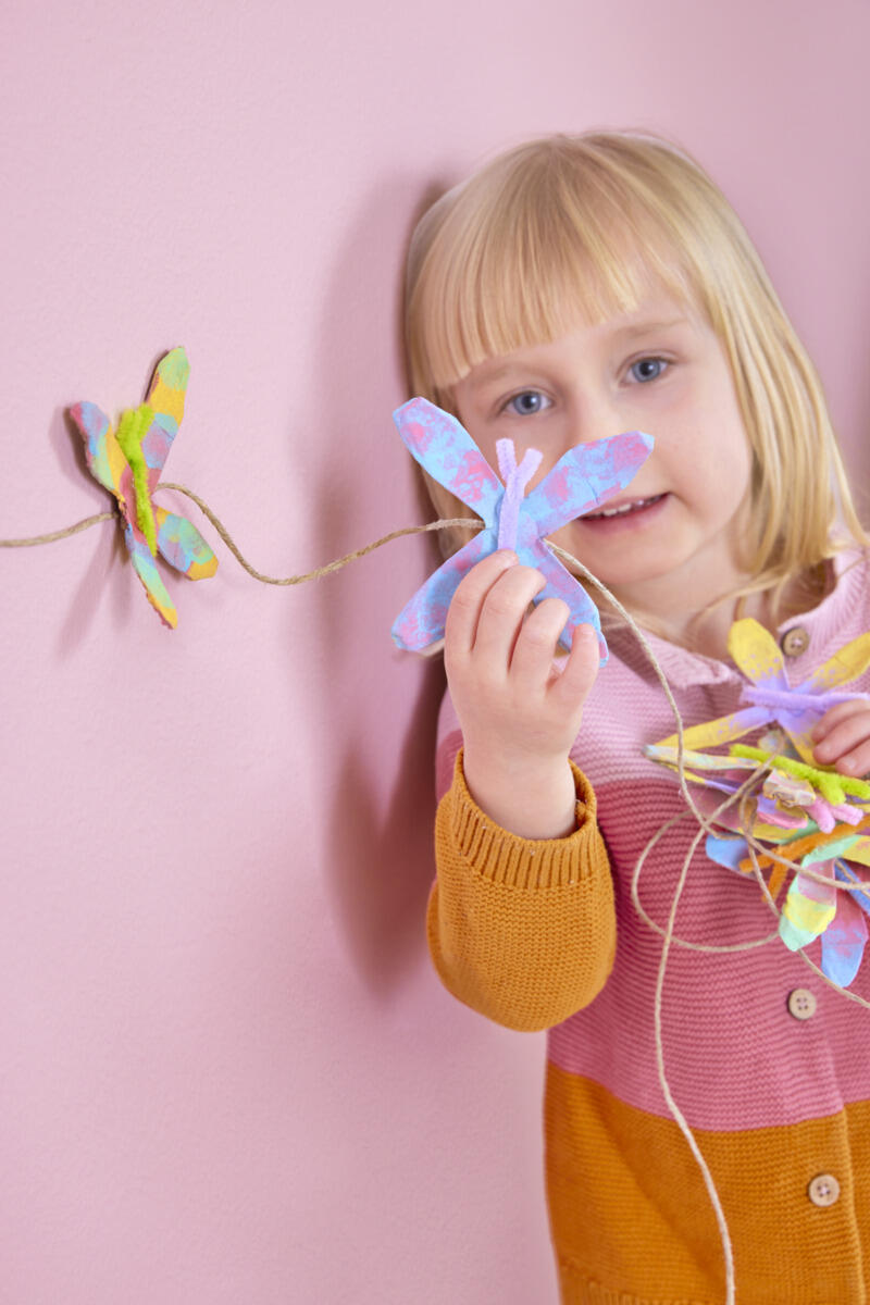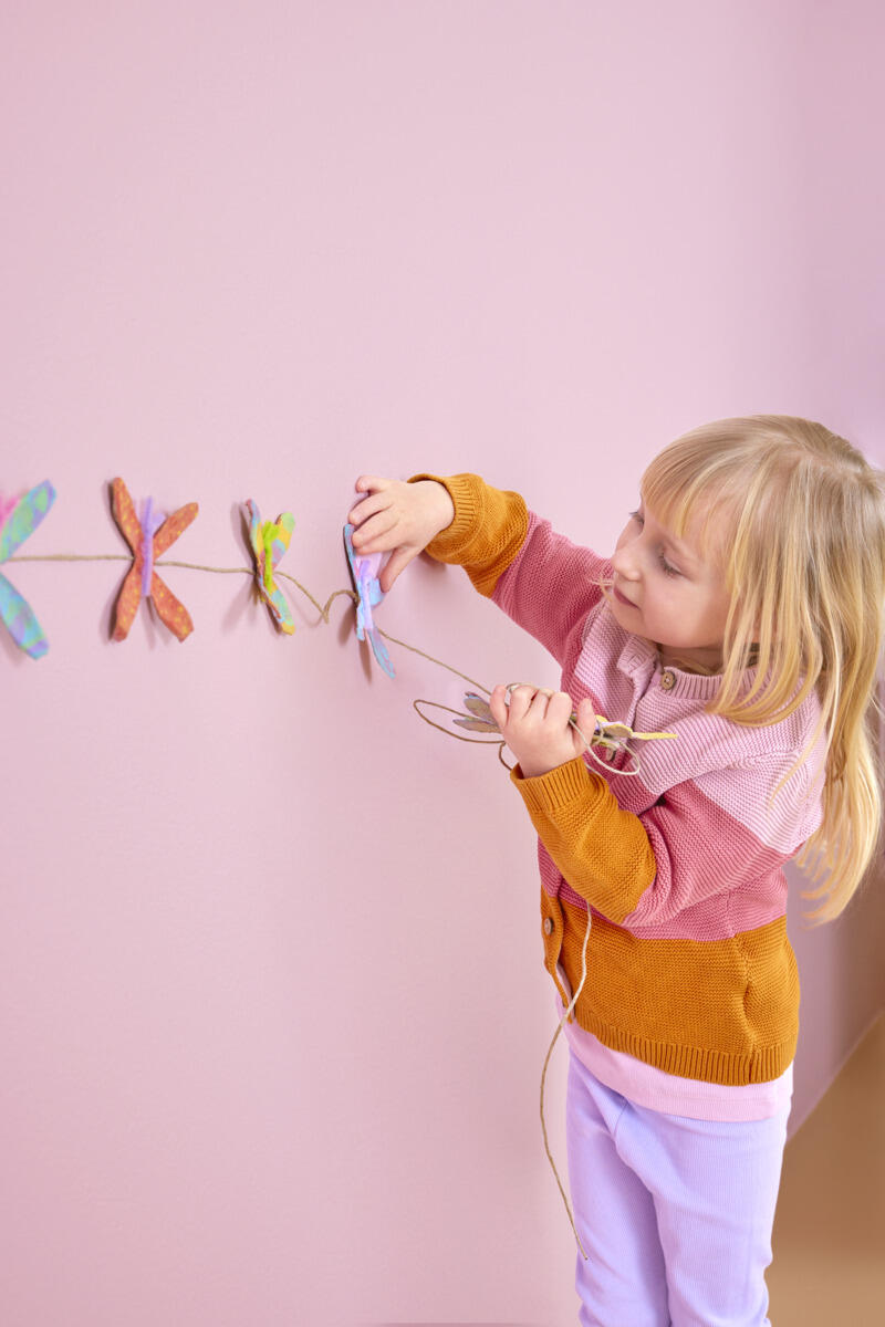 - Tips! Använd limpistol för bättre fäste. Limma fast alla fjärilar på ett snöre och häng upp din fina girlang!