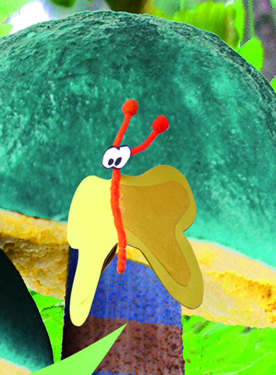 Klipp ut fjärilens vingar i gult papper. (Vik pappret och klipp, eller klipp ut två likadana och klistra ihop.)
