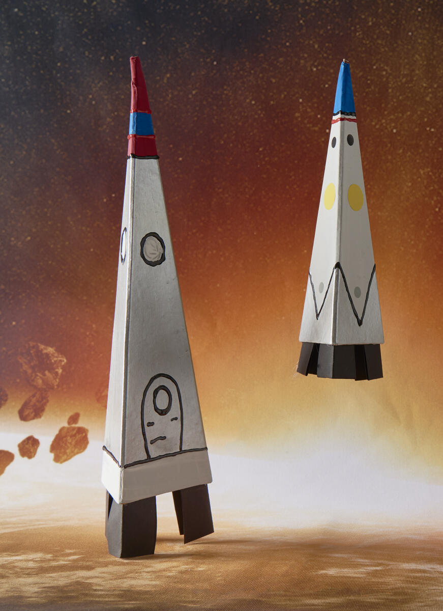 Klipp ut rektangler i svart kartong och limma på insidan av konens nedre kanter. Detta blir raketens ben.