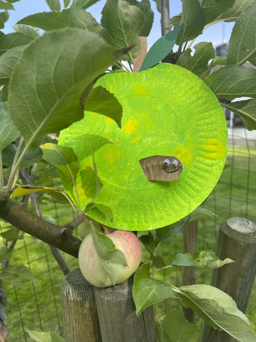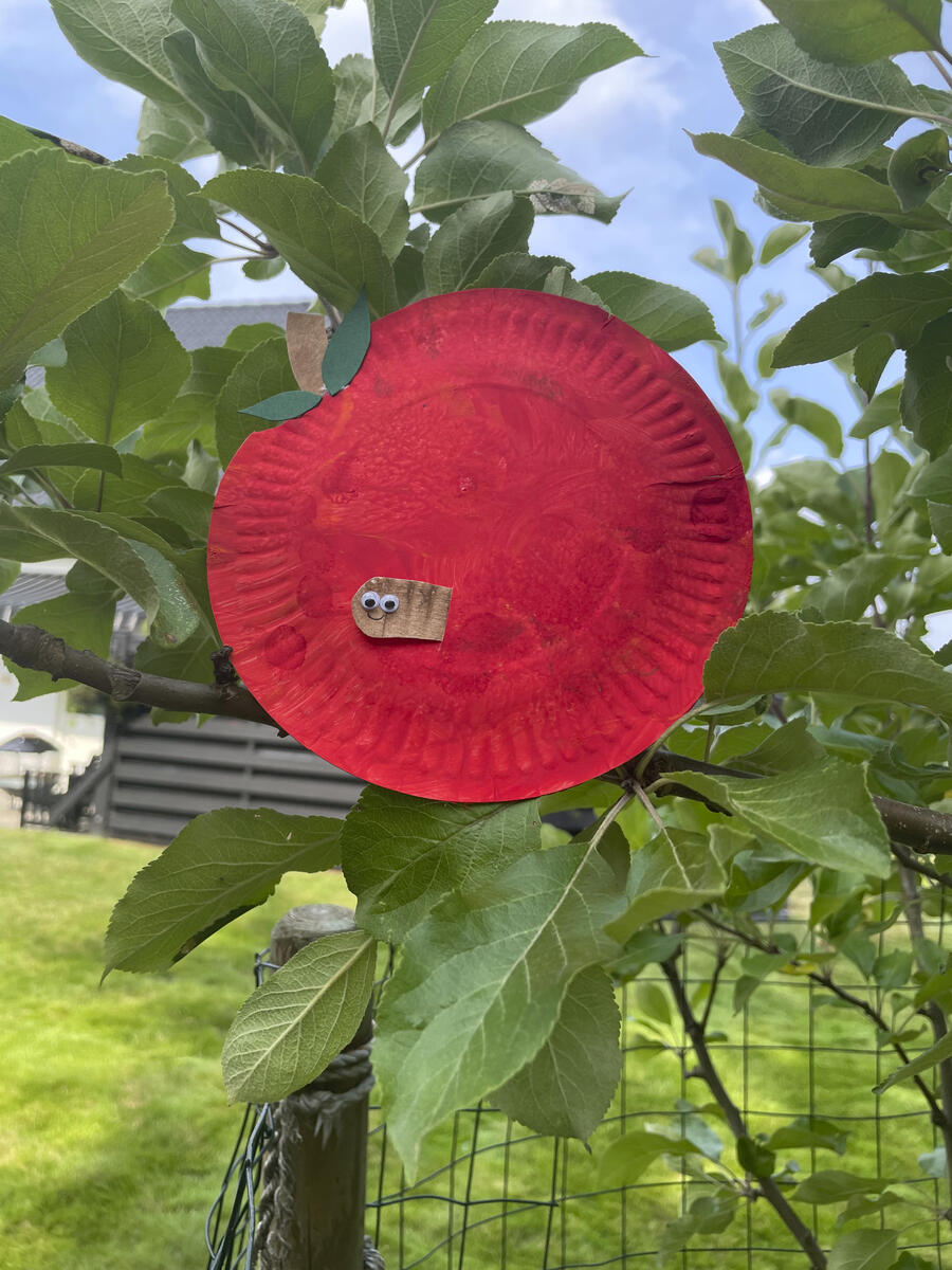 - Gör ett snitt i äpplet och stick ner masken i hålet. Limma fast på baksidan.