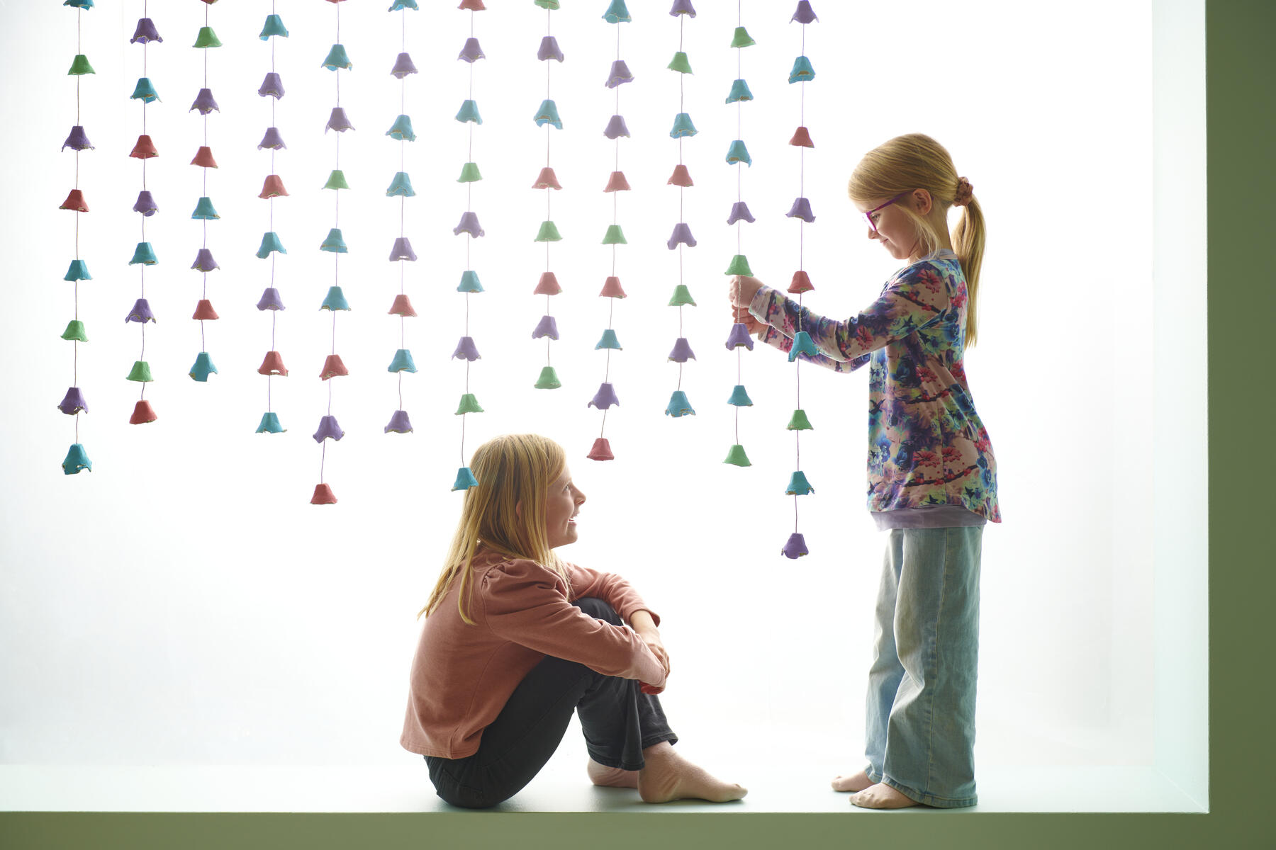 - Stick hål och trä hampagarn igenom öppningen. Trä sedan dit en pärla och knyt om pärlan så hålls äggkartongsblomman på plats.