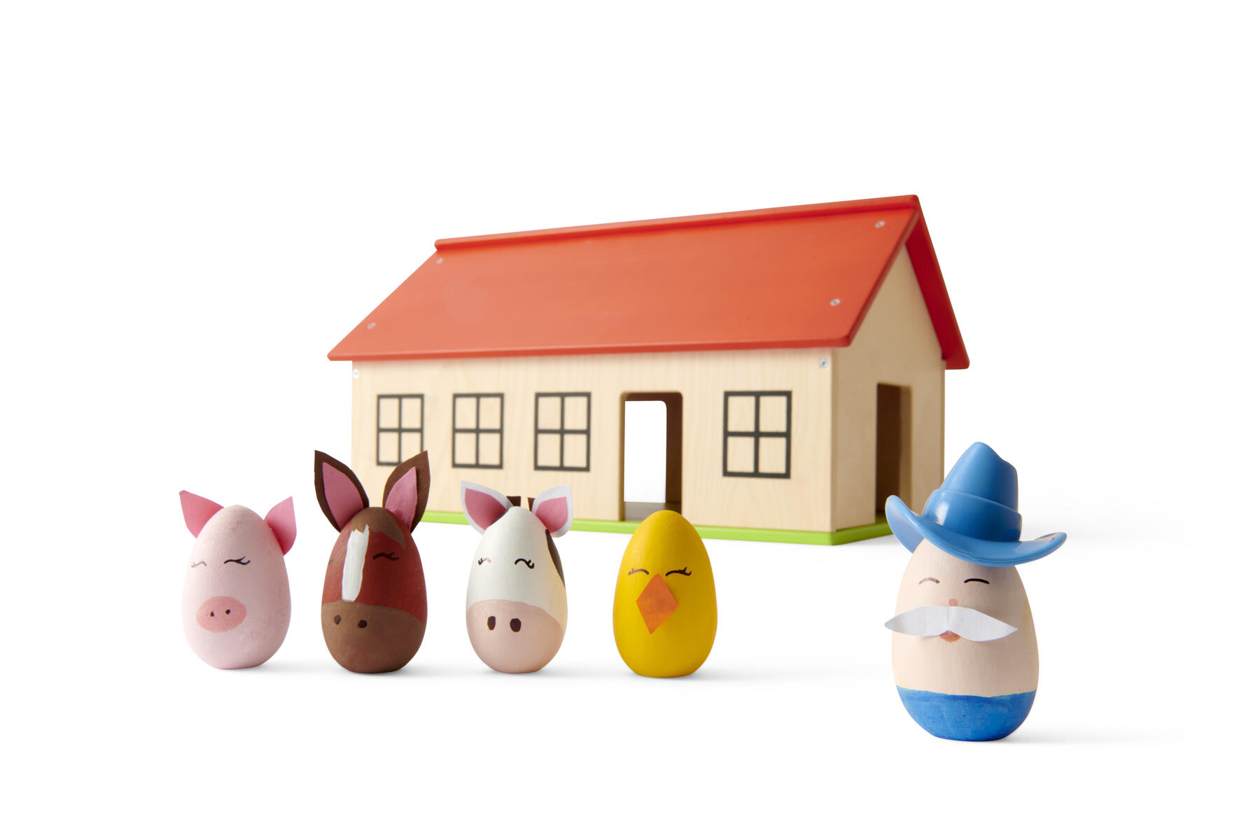 - Måla sen resten av detaljerna på häst, ko och gris med flytande färg eller tusch. Låt torka.