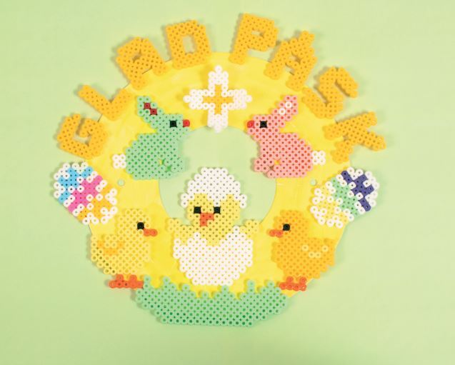 - Limma fast pärlplattorna på ett hårt underlag, såsom en papptallrik eller ett grövre papper såsom dekorationskartong. Klipp ett hål i mitten och dekorera kransen.