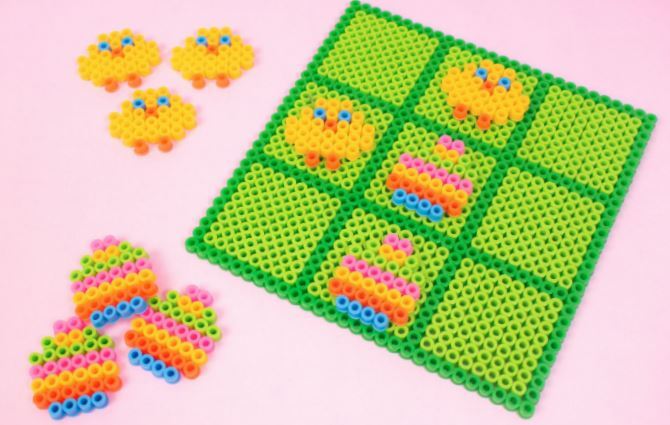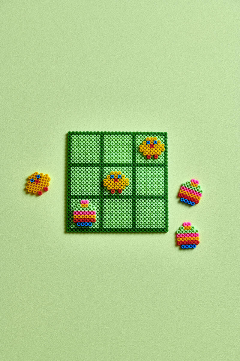 - Placera bakplåtspapper och stryk med strykjärn tills alla pärlorna smälts ihop. OBS! Ta hjälp av en vuxen när du ska stryka. Både strykjärnet och pärlorna blir mycket varma. Lägg något tungt över och låt dem svalna. Vill man undvika värme kan man istället använda limark för att hålla ihop pärlorna.