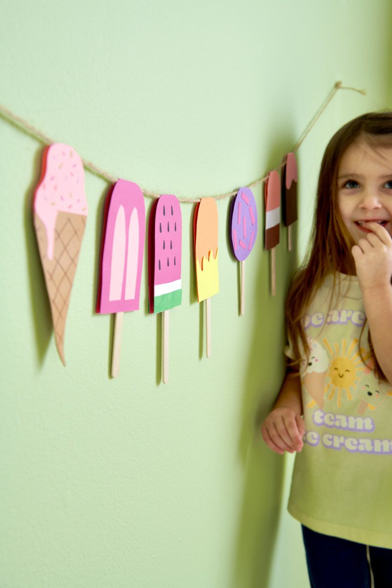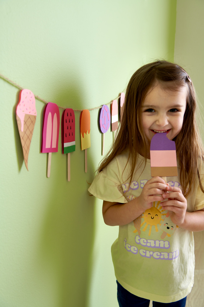 - Använd tonpapper i olika färger för att skapa just din favoritglass! Vik dubbelt och rita upp glassens form. Tänk på att glassens topp ska vara intill den vikta kanten för att ge stöd vid upphängning.