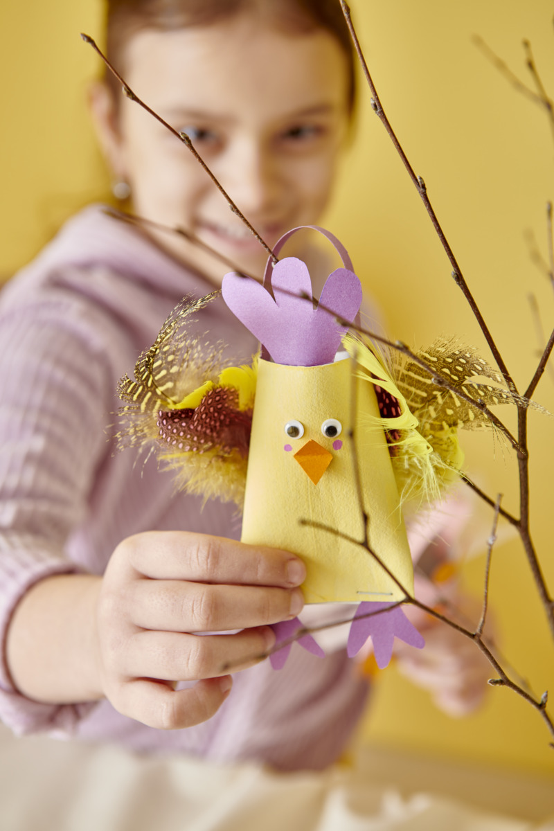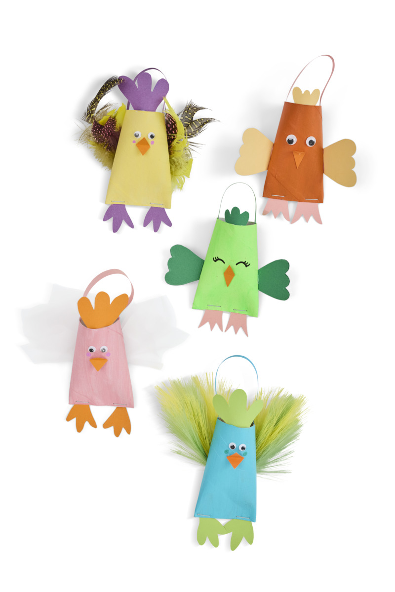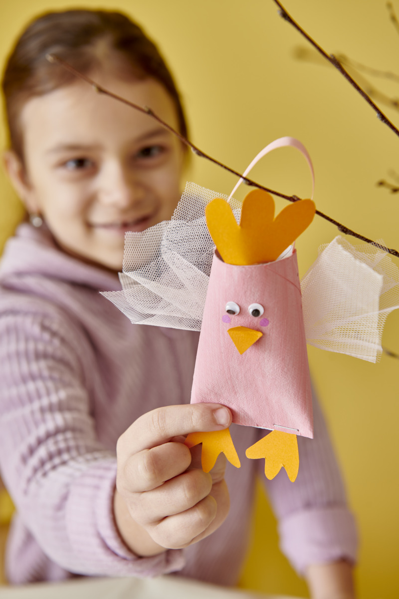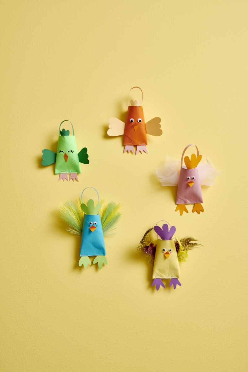 - Förbered och klipp ut kycklingens vingar, kam, näbb och fötter i papper. Alternativt till vingar och/eller kam kan du använda dig av fjädrar eller tyll för en lite busigare look!