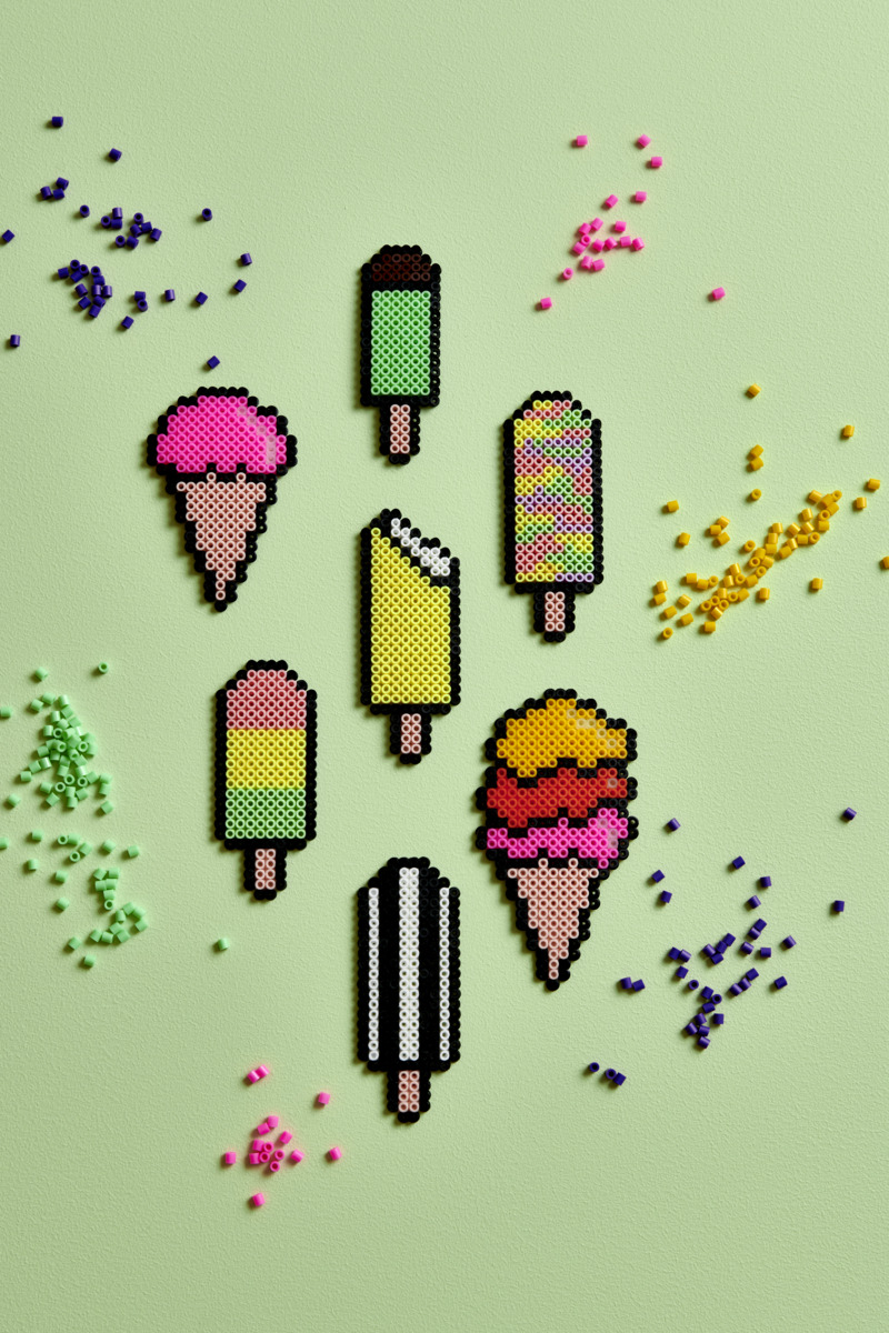 - Placera bakplåtspapper och stryk med strykjärn tills alla pärlorna smälts ihop. OBS! Ta hjälp av en vuxen när du ska stryka. Både strykjärnet och pärlorna blir mycket varma. Lägg något tungt över och låt dem svalna. Vill man undvika värme kan man istället använda limark för att hålla ihop pärlorna.