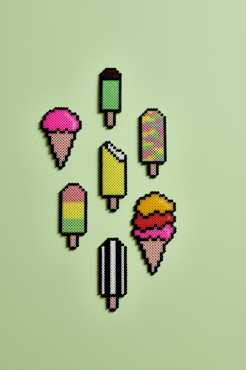 - Placera bakplåtspapper och stryk med strykjärn tills alla pärlorna smälts ihop. OBS! Ta hjälp av en vuxen när du ska stryka. Både strykjärnet och pärlorna blir mycket varma. Lägg något tungt över och låt dem svalna. Vill man undvika värme kan man istället använda limark för att hålla ihop pärlorna.