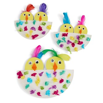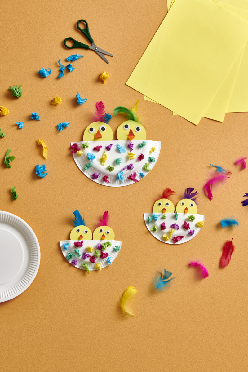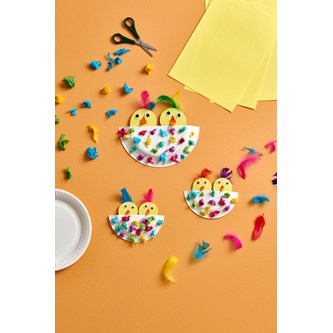 - Klipp ut små cirklar av dekorationskartong och limma fast på baksidan av tallriken, så att det bildar ett kycklinghuvud.