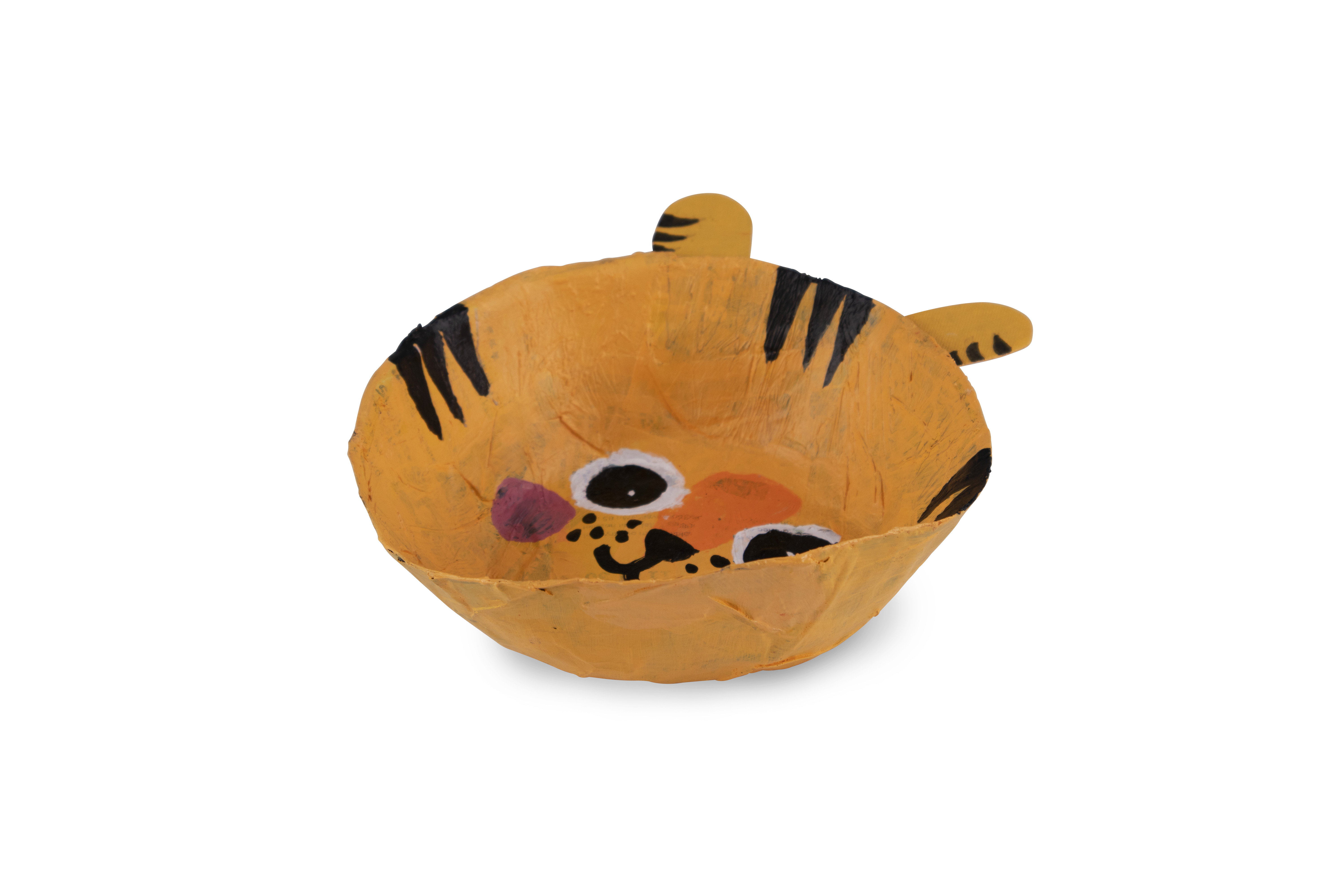 - Klipp ut små öron i kraftig papp och tejpa fast på papier machéskålen.