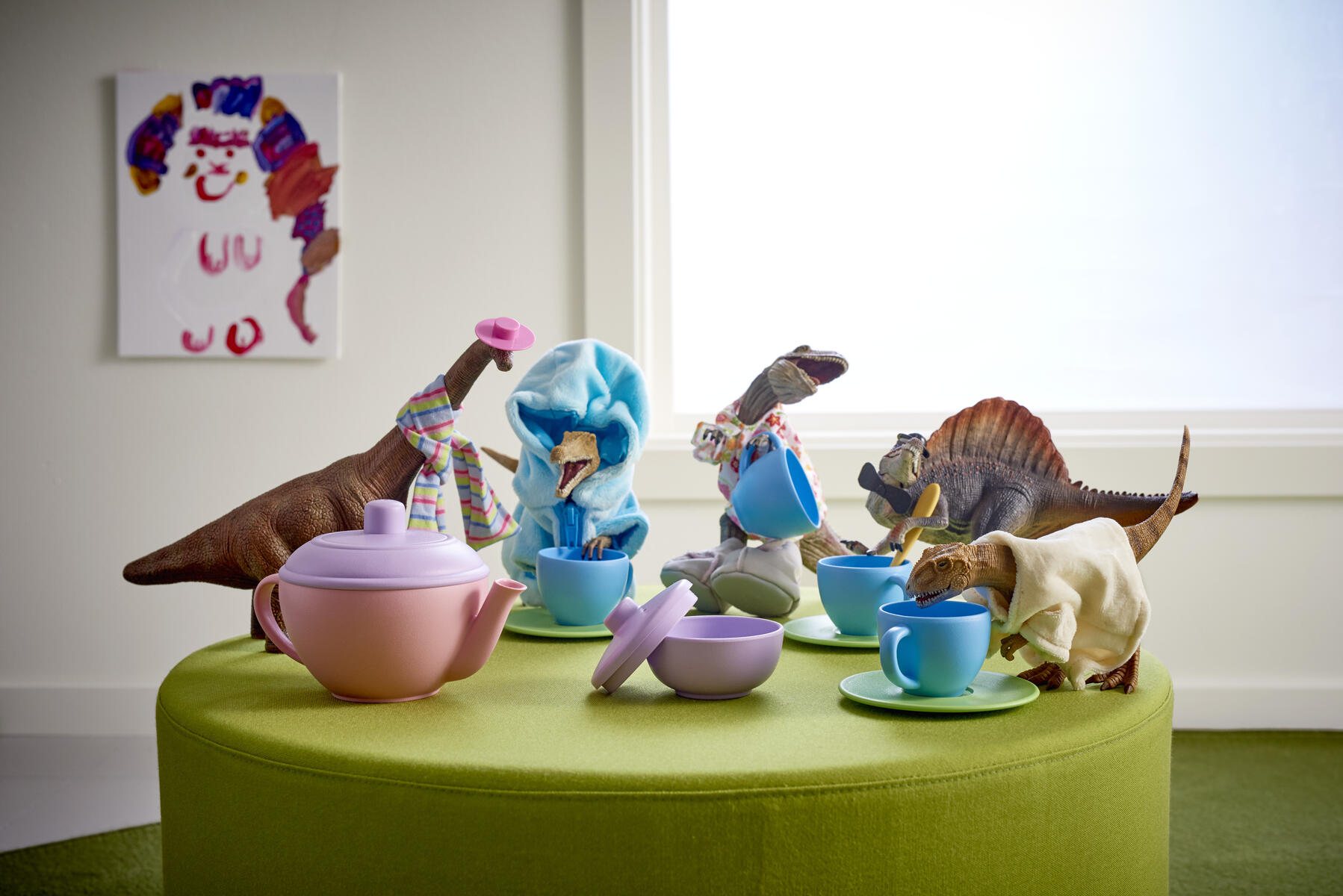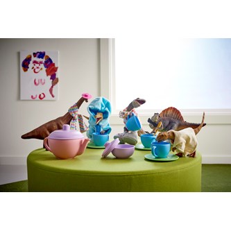 En morgon är det kaos. Kakor, porslin och sockerbitar ligger utspridda. Det är såklart dinosaurierna som varit framme. Under natten har de smitit in på dockornas teparty och haft lite för roligt.