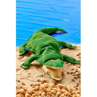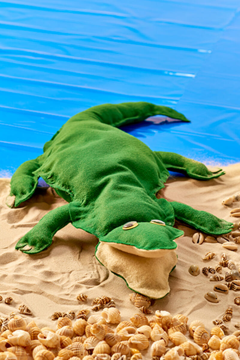 - Rita upp ett mönster av en krokodil på filten. Benen ritas separat. Vik filten dubbel och klipp ut.