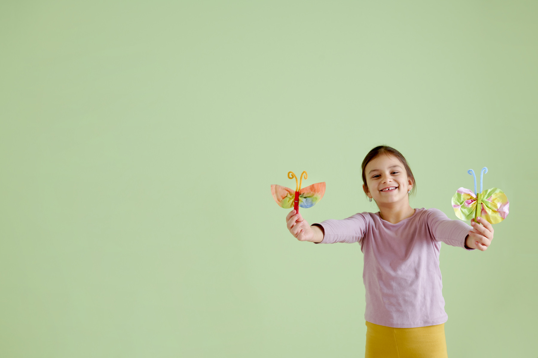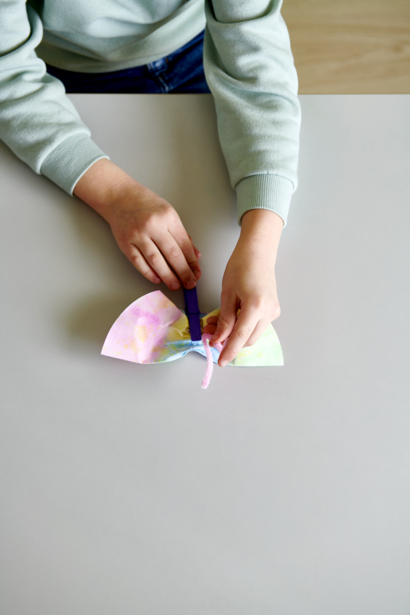 - Ta piprensare i valfri färg, klipp av, vik på mitten och gör till antenner. Öppna klädnypan en aning och knip fast antennerna.