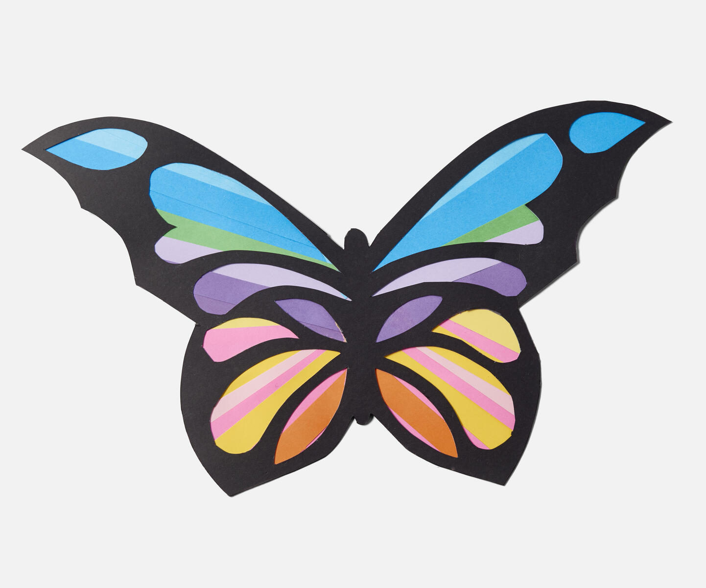 - Lägg ut ränder och klistra fast dessa under den svarta fjärilen. Enklast är att göra raka ränder, mer avancerat att lägga ränderna i solfjädersform.
