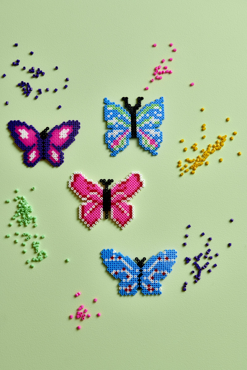 - Placera bakplåtspapper och stryk med strykjärn tills alla pärlorna smälts ihop. OBS! Ta hjälp av en vuxen när du ska stryka. Både strykjärnet och pärlorna blir mycket varma. Lägg något tungt över och låt dem svalna. Vill man undvika värme kan man istället använda limark för att hålla ihop pärlorna.