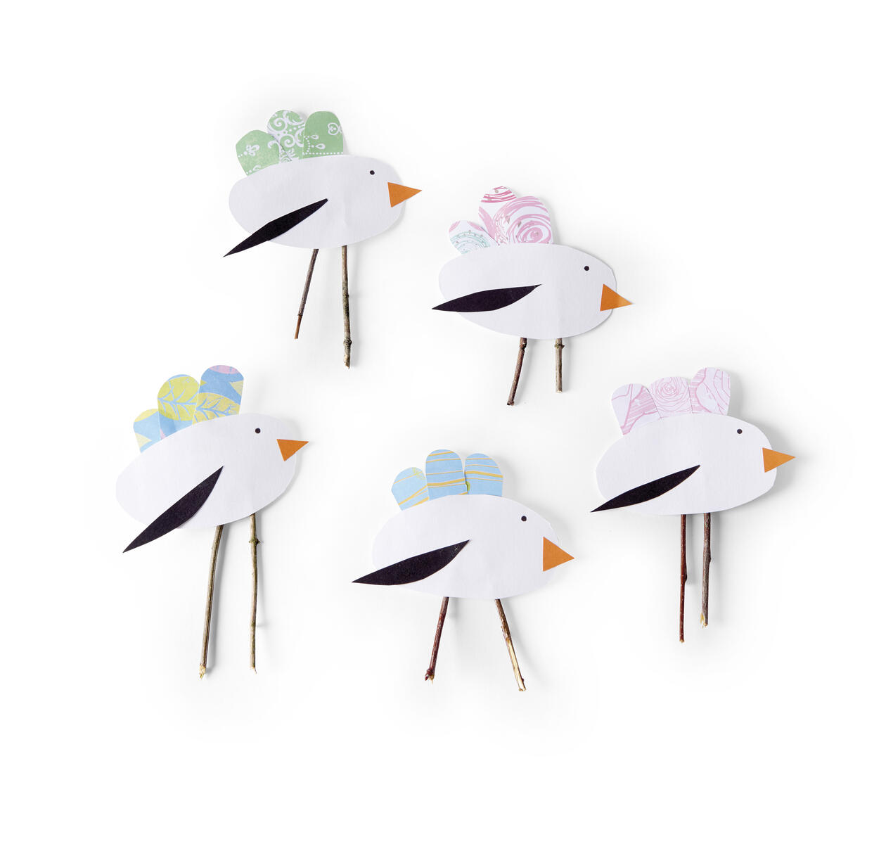 Fågelns ben är pinnar som limmats fast på baksidan av fågeln.
