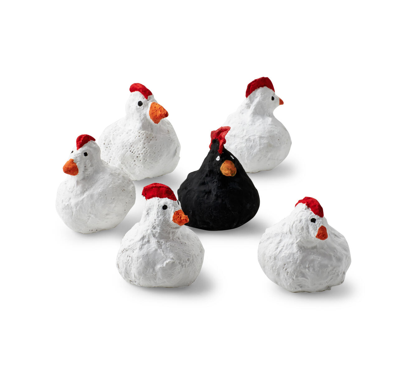 - Gipsytan blir liksom de målade ytorna helt matt och lite känslig för beröring. För en tåligare yta målas hönorna med matt decoupagelack, men då måste både gips och färg vara helt torr först.