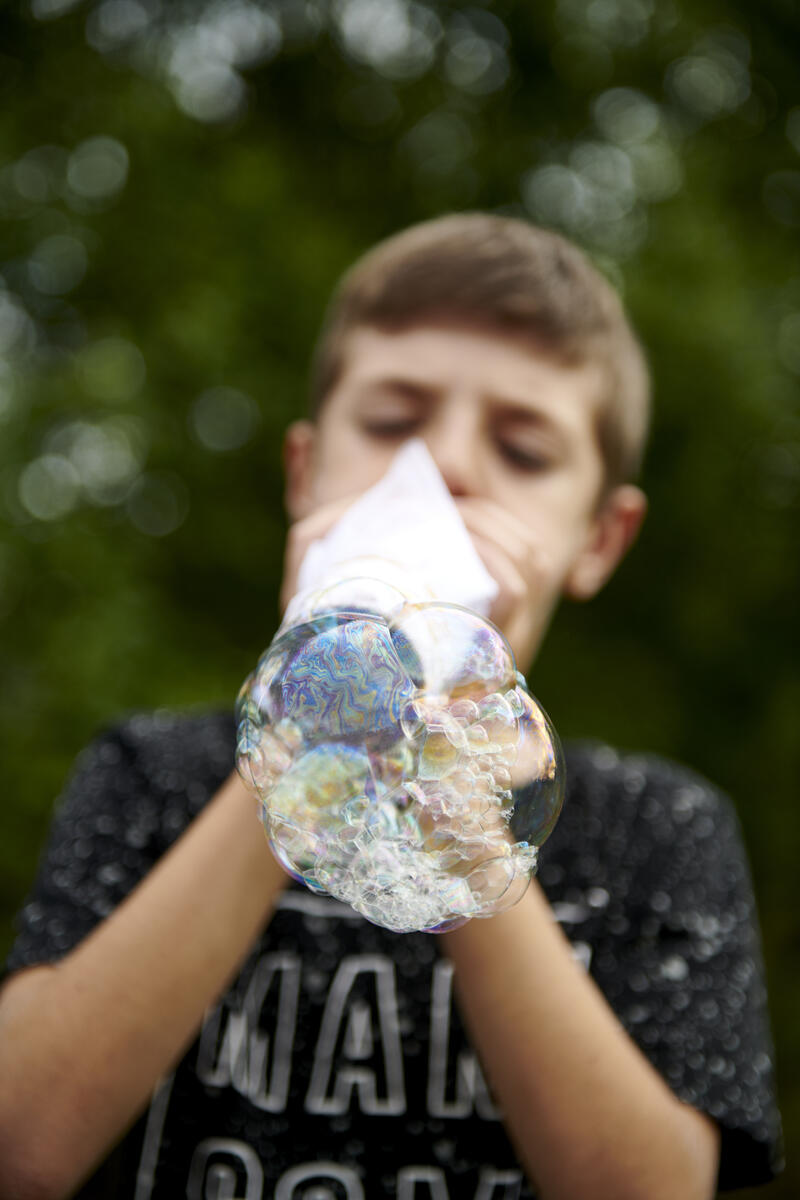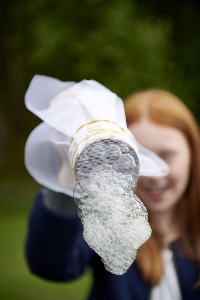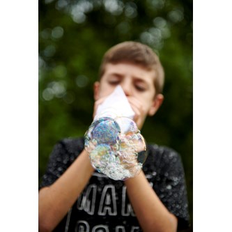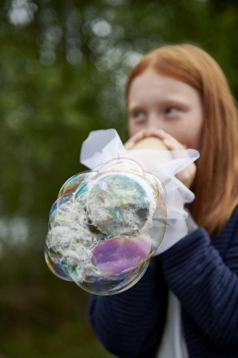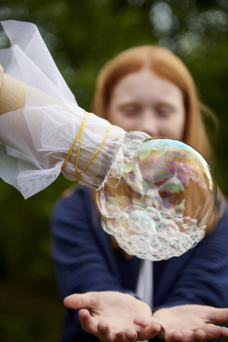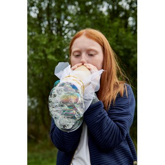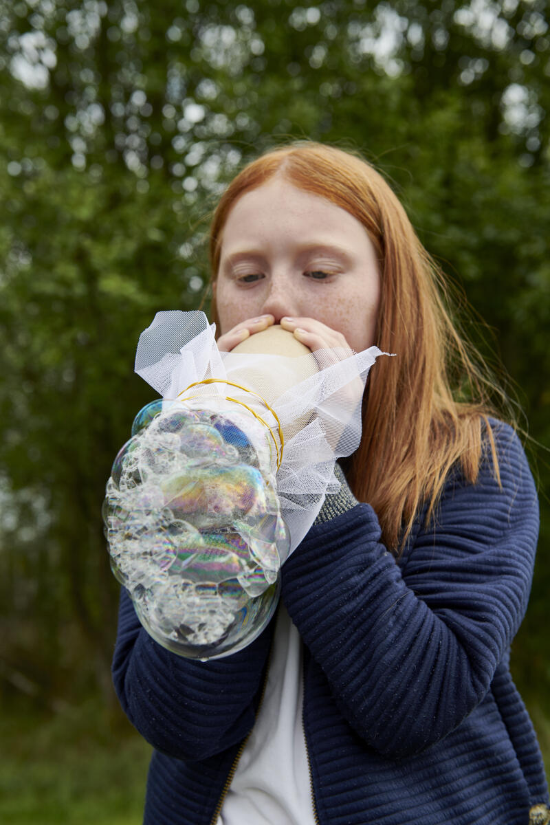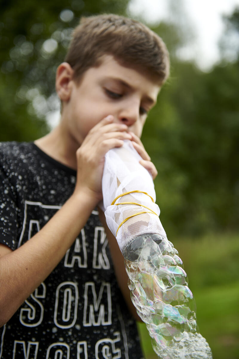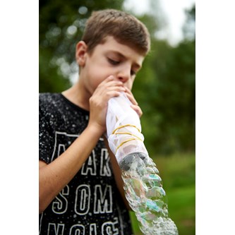 Fäst ett tyg runt en papprulle med hjälp av ett gummiband. Blanda sedan såpbubbelvatten och doppa ändarna med tyg där i. Man måste sedan täcka hela hålet i pappröret med munnen för att försiktigt kunna blåsa ut långa korvar med såpbubblor.