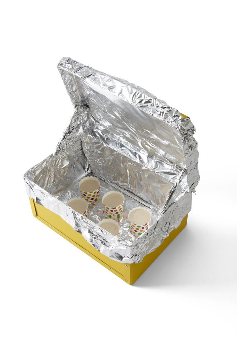 Klä en låda med aluminiumfolie. Lägg ned en termometer som tål hög värme.