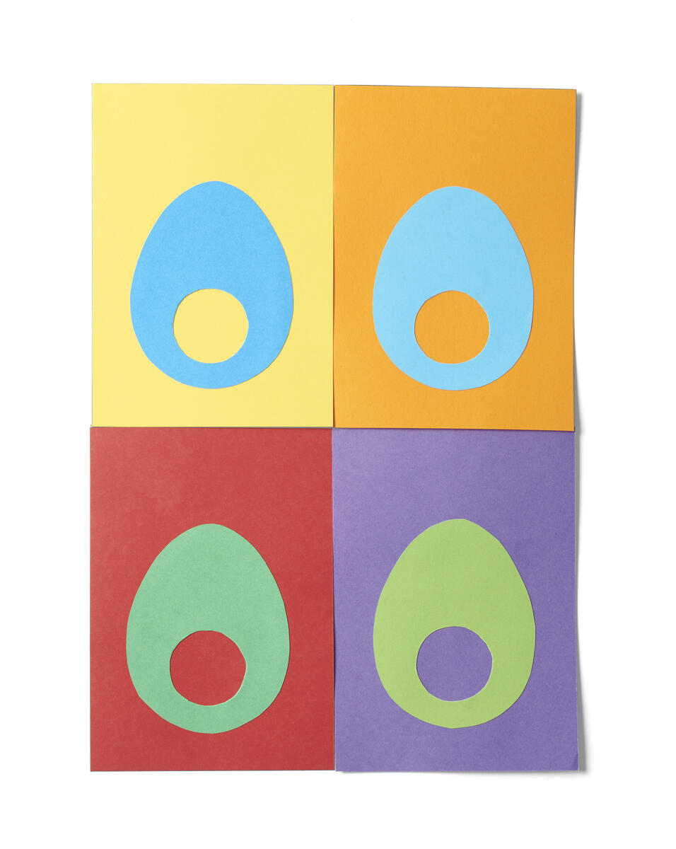 Klipp ut en form (ägget) i de andra två sekundärfärgerna och klipp ett hål (gulan) någonstans i mitten av formen.