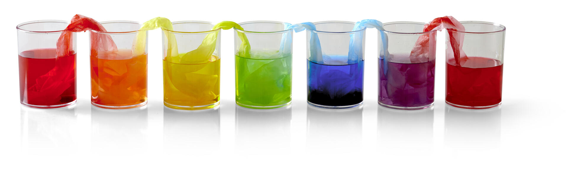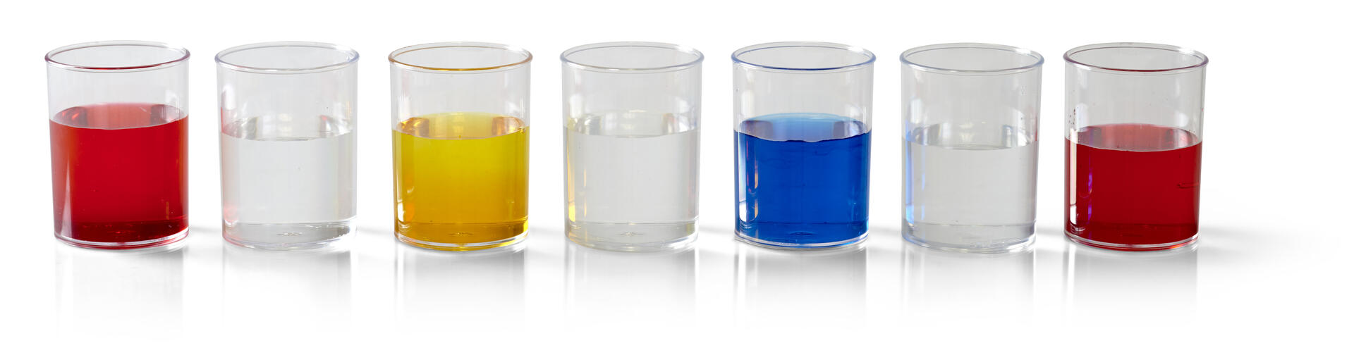 Ställ upp sju plastkoppar med vatten. Färga vattnet i varannan skål med hushållsfärg (karamellfärg) enligt bilden.