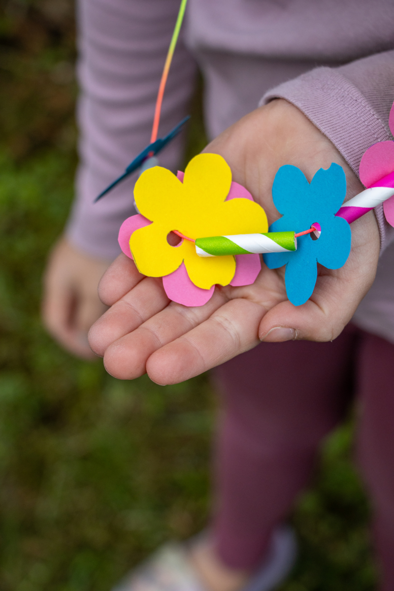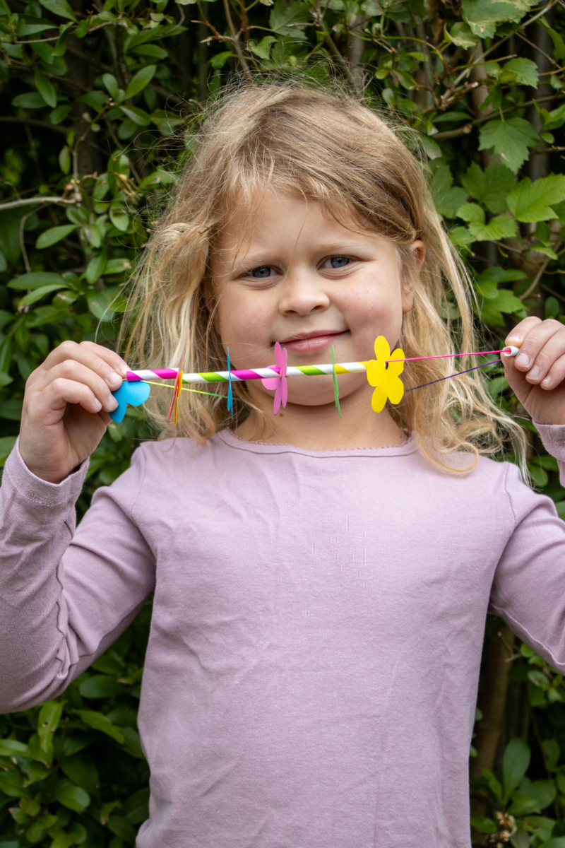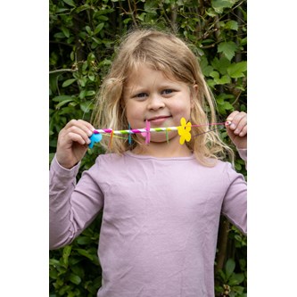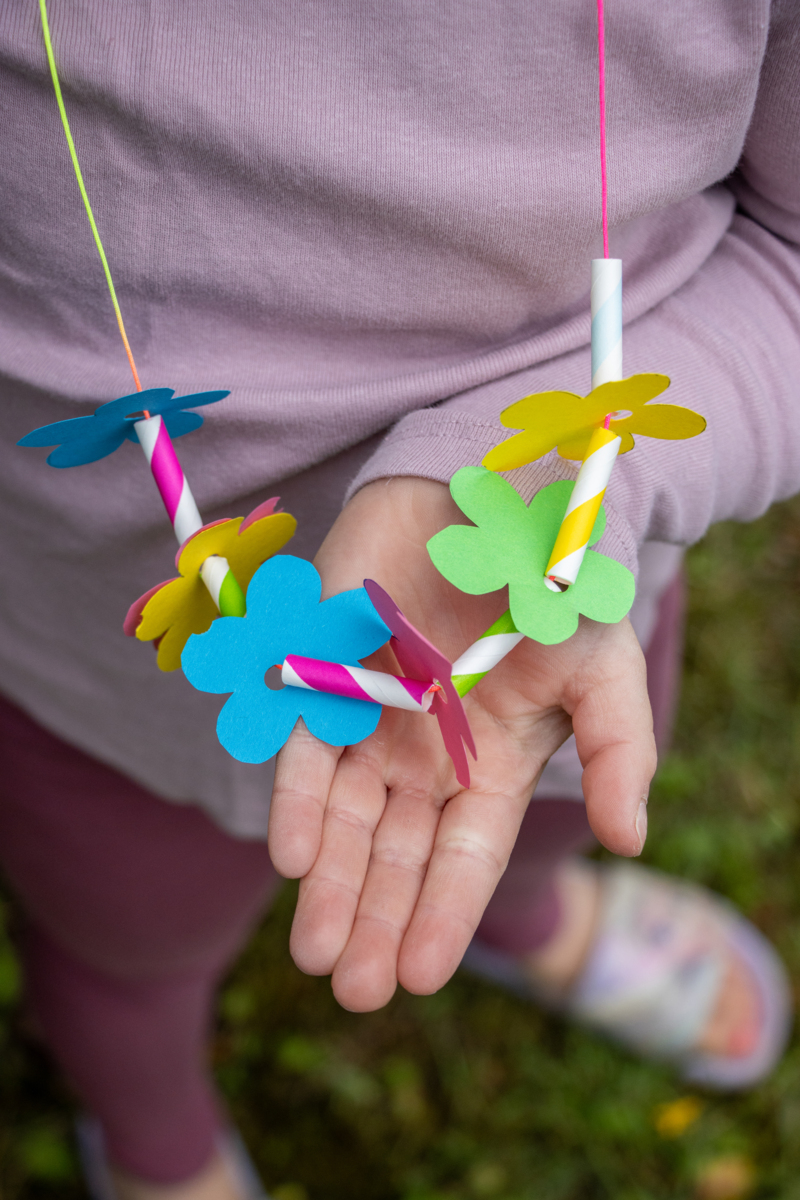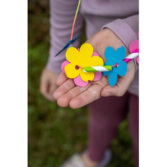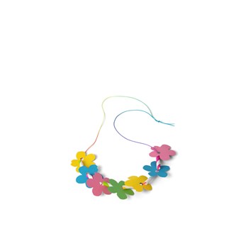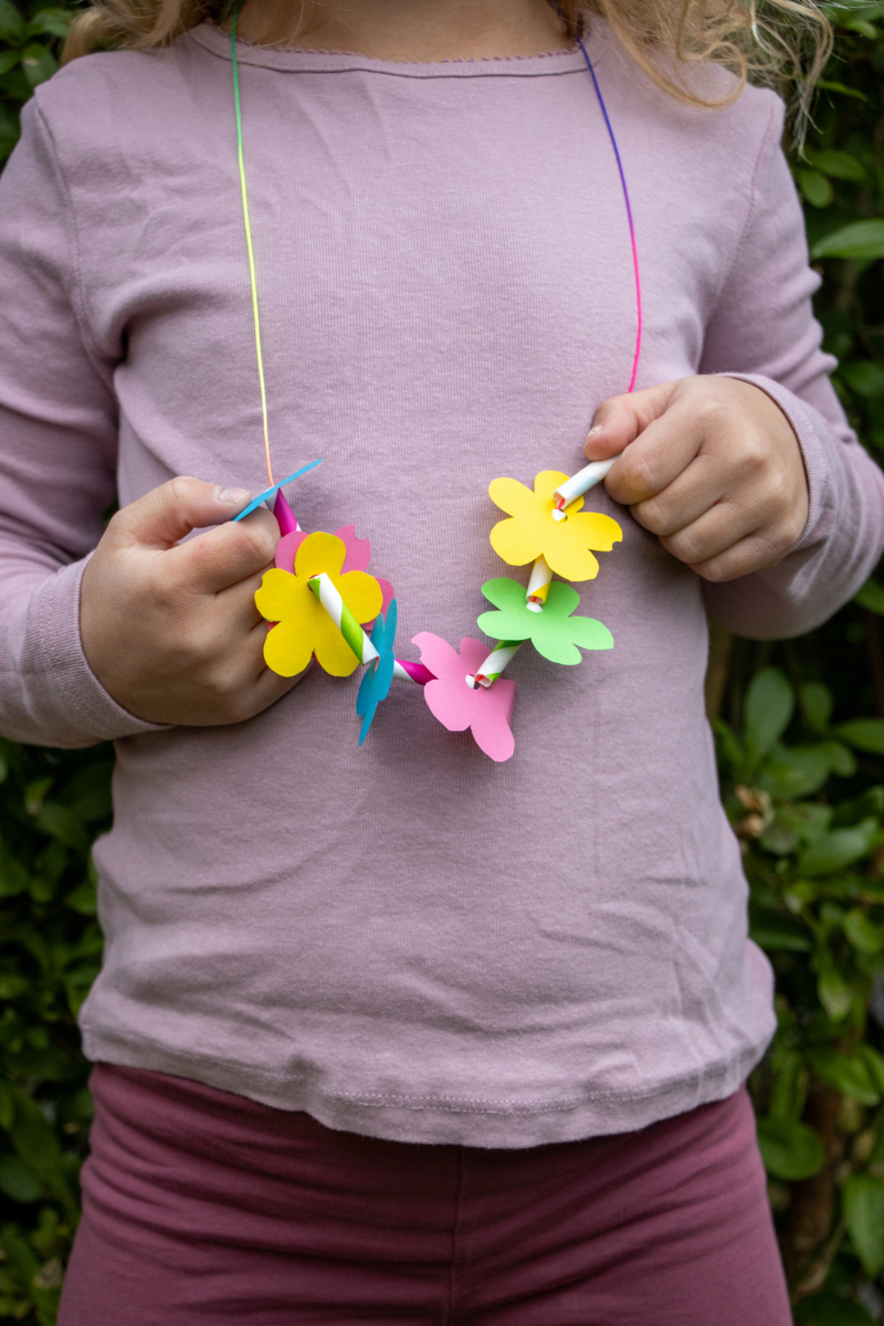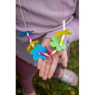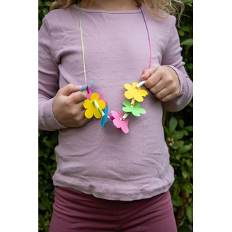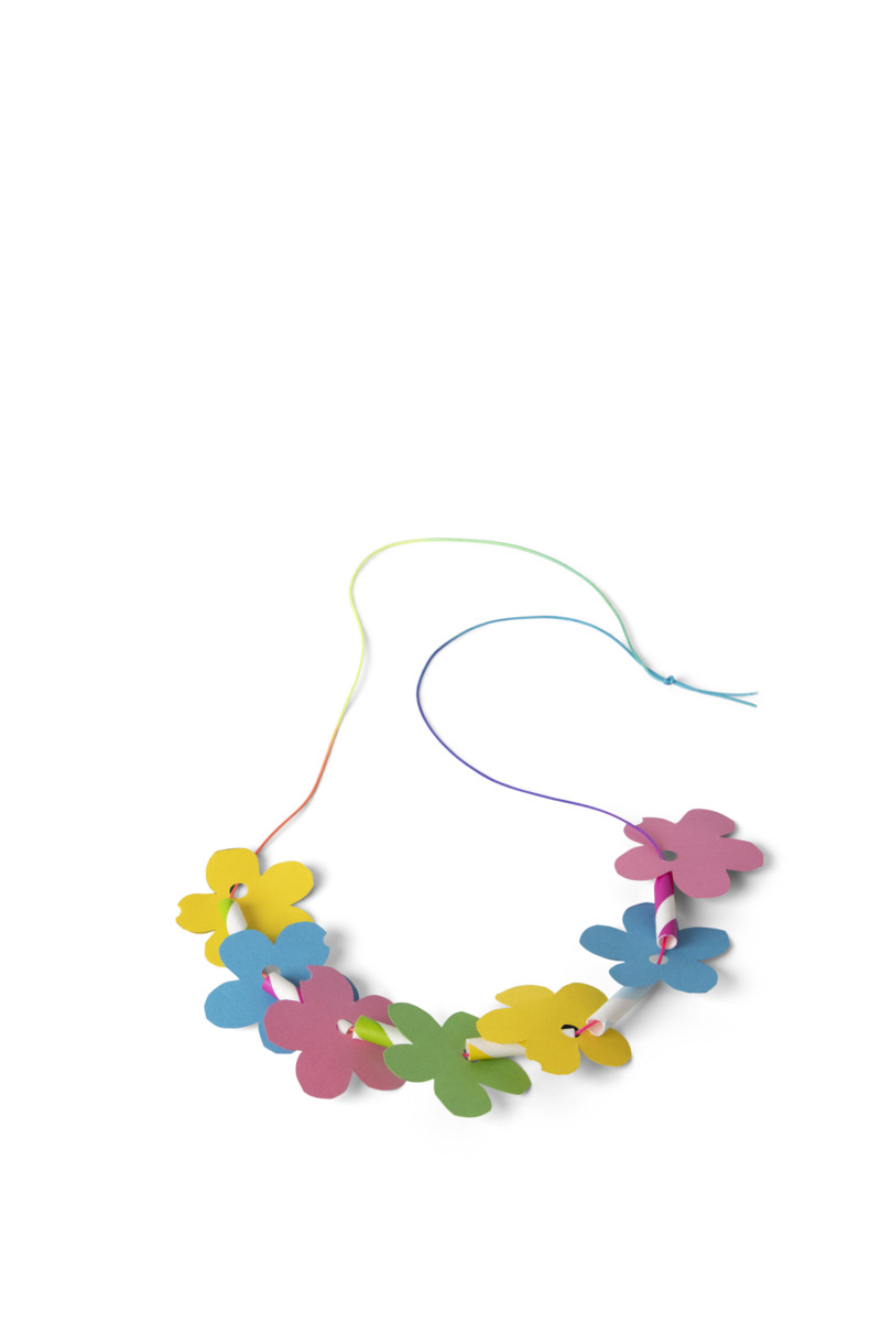 - Ta fram färgat papper i de färger du vill använda till blommorna och skissa hur du vill att blommorna ska se ut med blyertspenna, eller använd mallen som finns under dokument och filer. Klipp ut blommorna och gör hål i dem med en hålstans eller hålslag och trä dem på halsbandstråden. Sätt sugrörsbitar mellan varje blomma. När du är klar med det antal blommor du vill ha i halsbandet (7 till 10 kan vara lagom) så knyter du ihop snöret.