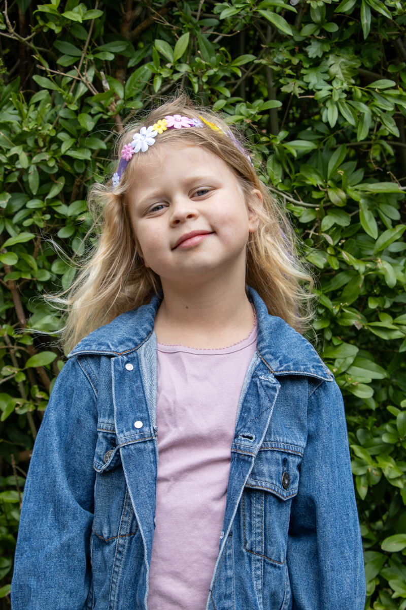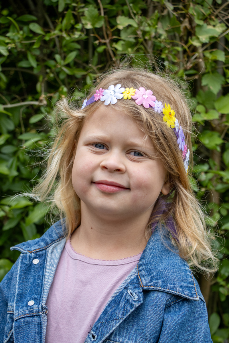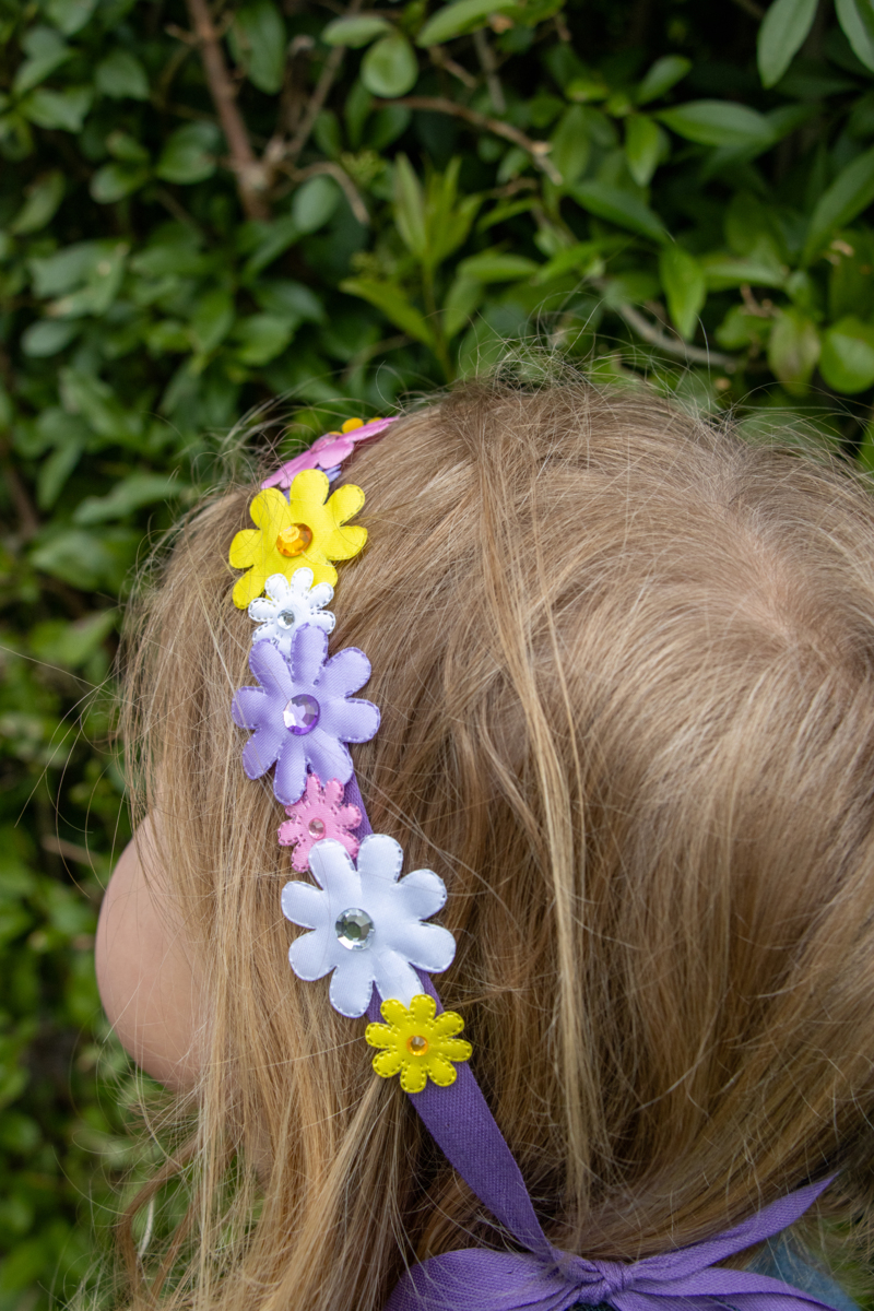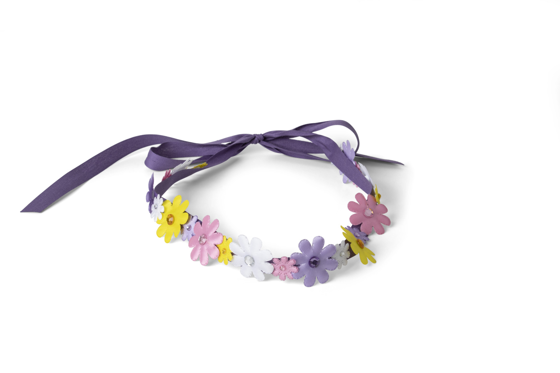 - Välj vilka blommor du vill dekorera med och fäst dem på bomullsbandet (de är självhäftande) med lagom avstånd till varandra. Knyt ihop bandet så att det passar runt ditt huvud.