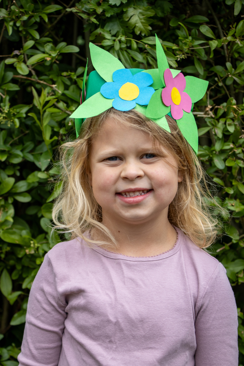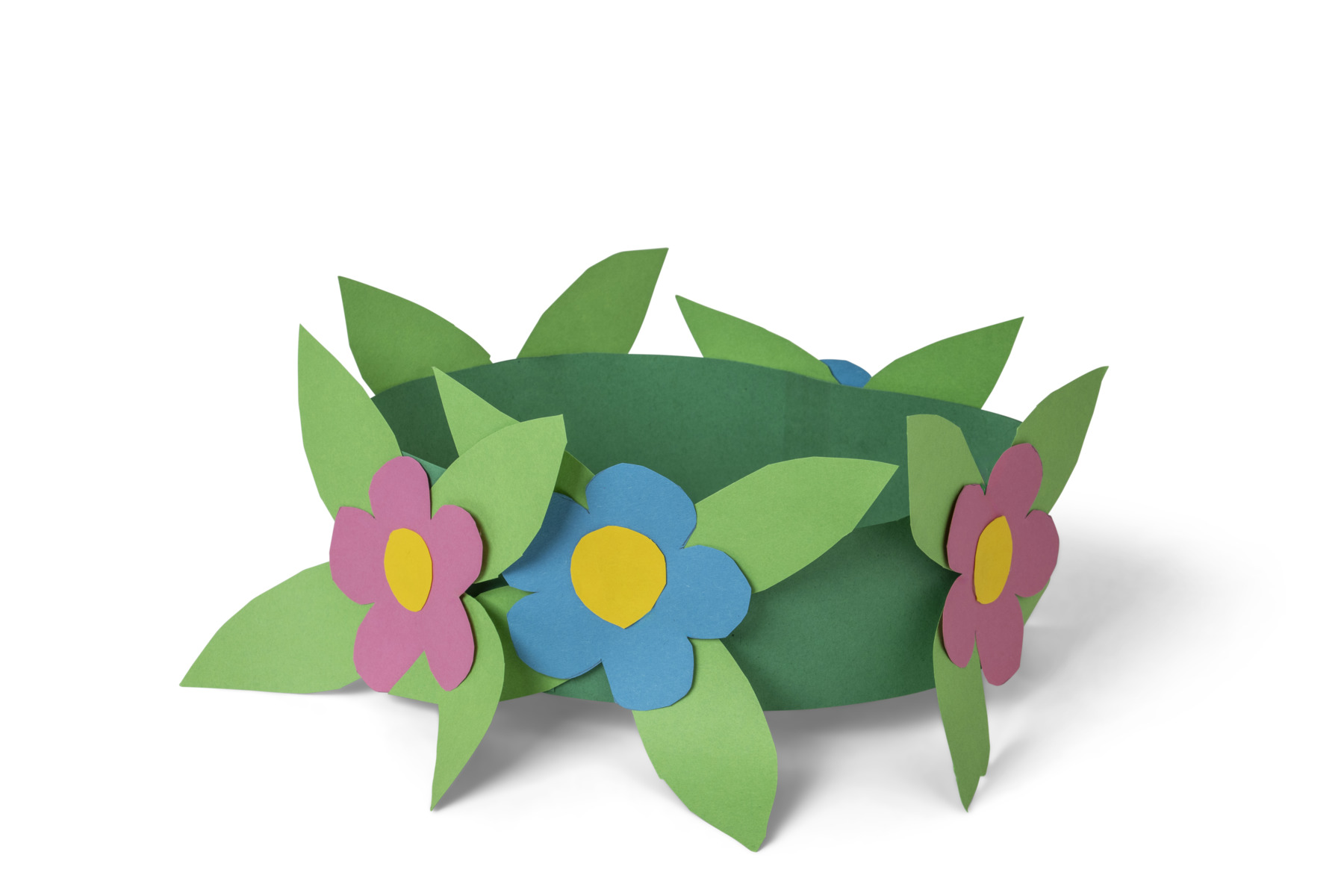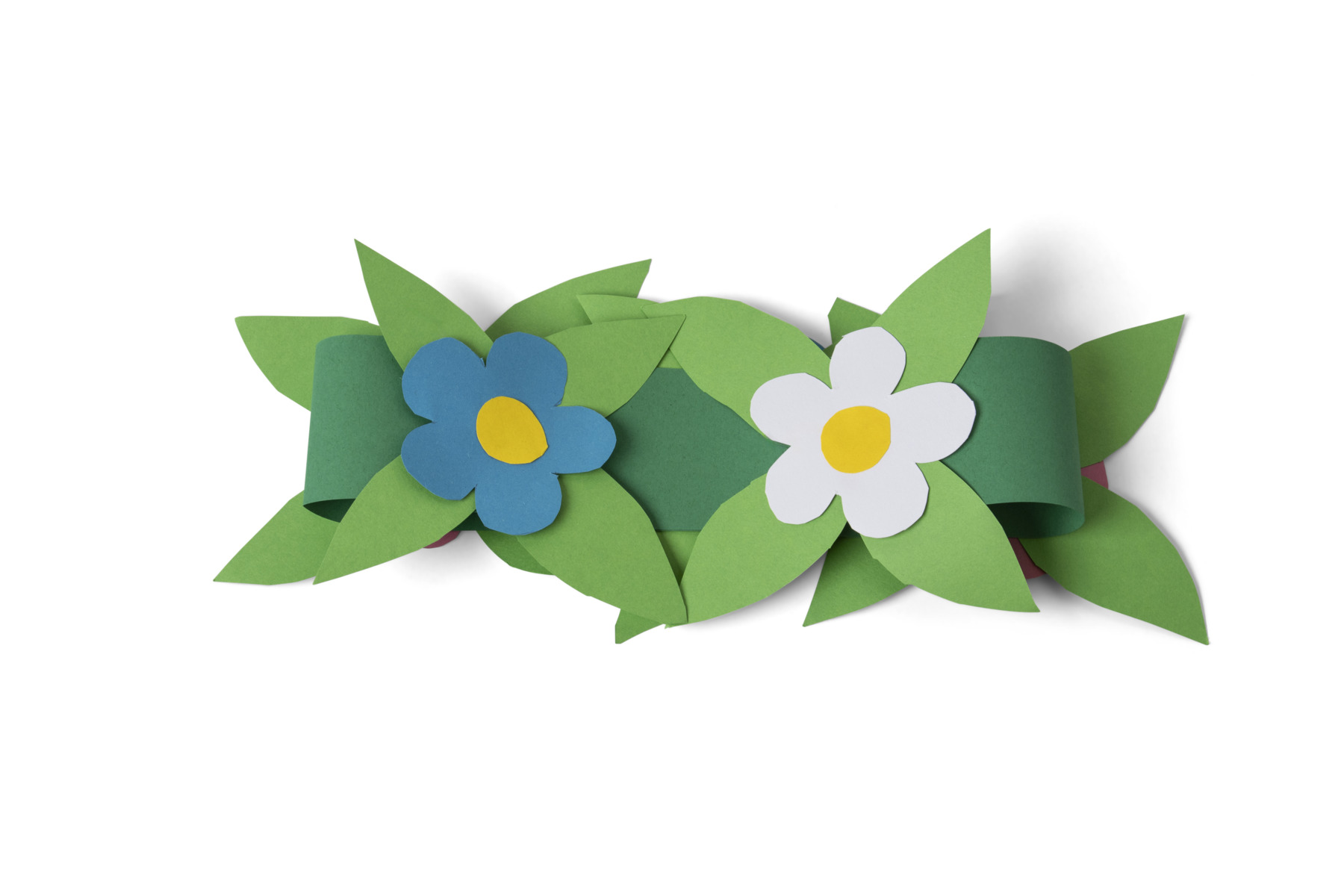 - Ta fram färgat papper i de färger du vill använda till blommorna och skissa hur du vill att blommorna ska se ut med blyertspenna, eller använd mallen som finns under dokument och filer. Klipp ut blommorna och fäst dem på din krans (limma eller häfta fast dem). När du dekorerat klart med blommor så böj ihop kransen och måtta in den så att den passar på huvudet. Markera och limma ihop (sätt gärna en tejpbit på insidan för extra hållbarhet).