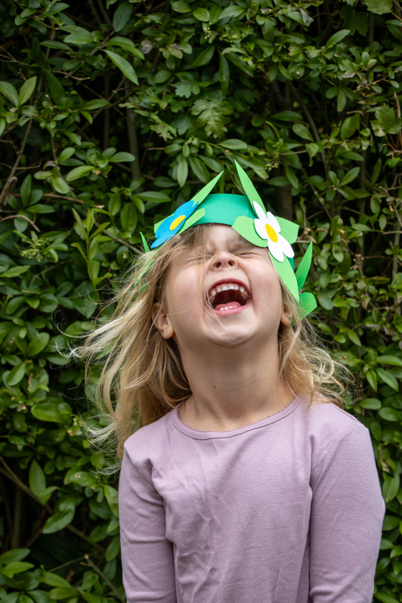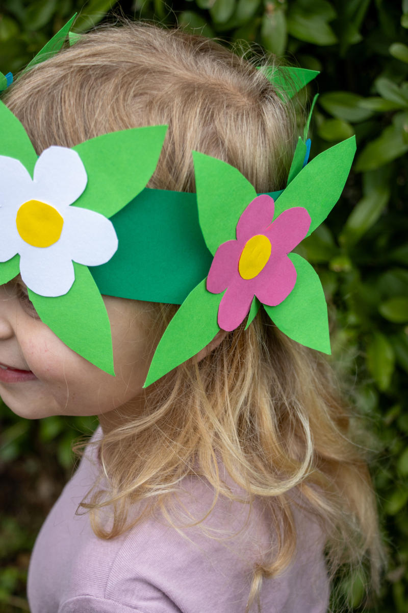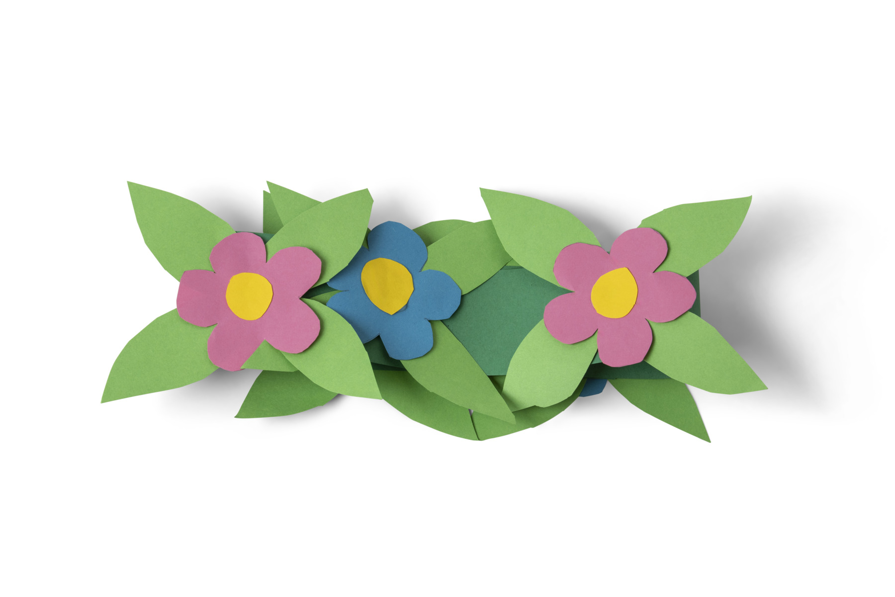 - Ta fram färgat papper i de färger du vill använda till blommorna och skissa hur du vill att blommorna ska se ut med blyertspenna, eller använd mallen som finns under dokument och filer. Klipp ut blommorna och fäst dem på din krans (limma eller häfta fast dem). När du dekorerat klart med blommor så böj ihop kransen och måtta in den så att den passar på huvudet. Markera och limma ihop (sätt gärna en tejpbit på insidan för extra hållbarhet).