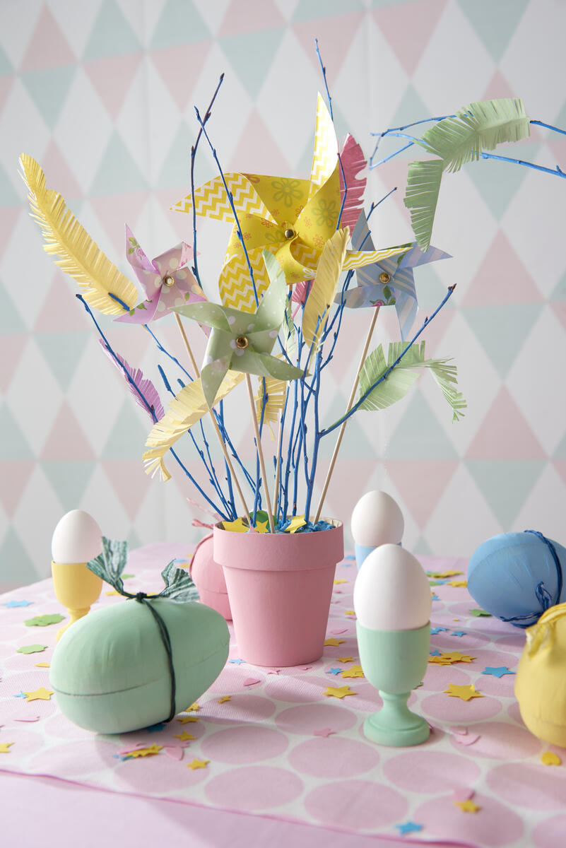 - Sätt en påsklämma med stort huvud genom hålen i vindsnurran och fäst en pärla eller ngt mellan snurran och trästaven.kläm fast snurran runt en trästav.