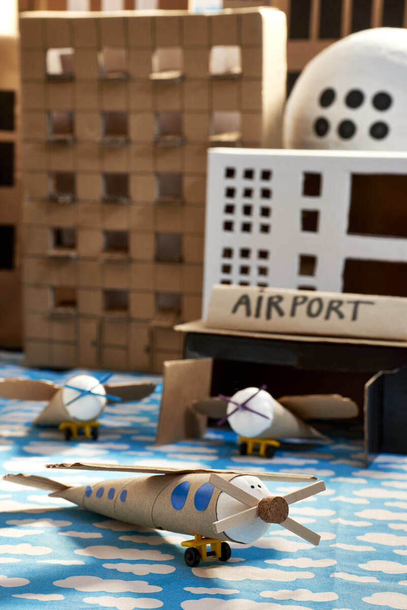 Klipp ut vingar i wellpapp och limma på flygplanet.