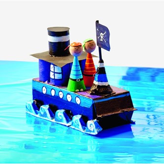 Basen till skeppet är gjort av en mjölkförpackning. Hytten och skorstenen är gjorda av pappersrullar. Taket på hytten och toppen på skorstenen är gjort av svart kartongpapper. Vågorna och masten är gjora av delar från en äggkartong. Flaggan är gjord av bit blompinne och en bit papper där piratsymbolen har ritats. Limma först ihop alla delar till båten. Sen är det bara att måla den för att få den att se ut som en båt.
