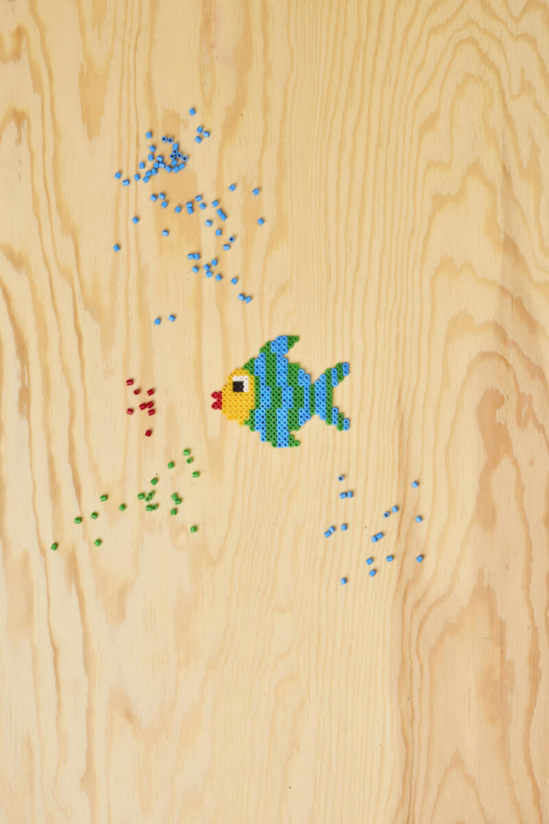 - Placera bakplåtspapper och stryk med strykjärn tills alla pärlorna smälts ihop. OBS! Ta hjälp av en vuxen när du ska stryka. Både strykjärnet och pärlorna blir mycket varma. Lägg något tungt över och låt dem svalna. Vill man undvika värme kan man istället använda limark för att hålla ihop pärlorna.